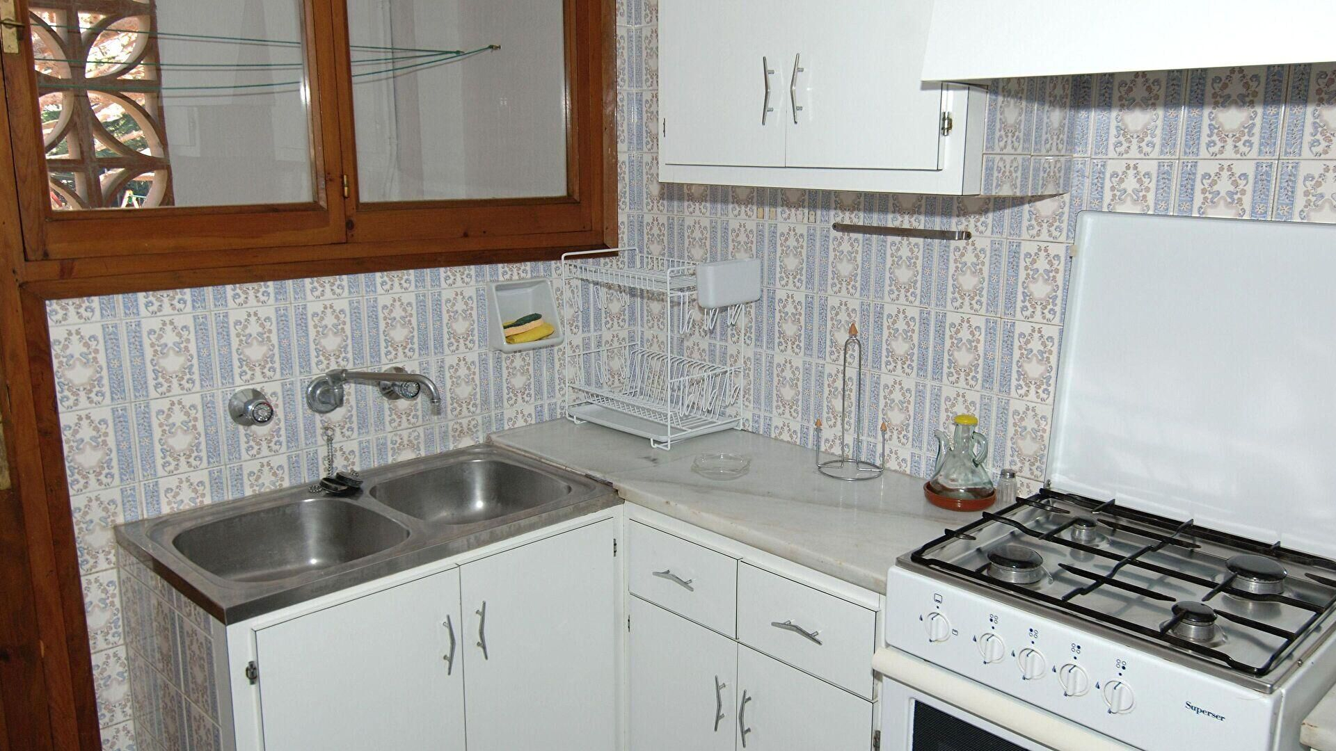 - Cuisine avec cuisinière à gaz, four, réfrigérateur et machine à laver.