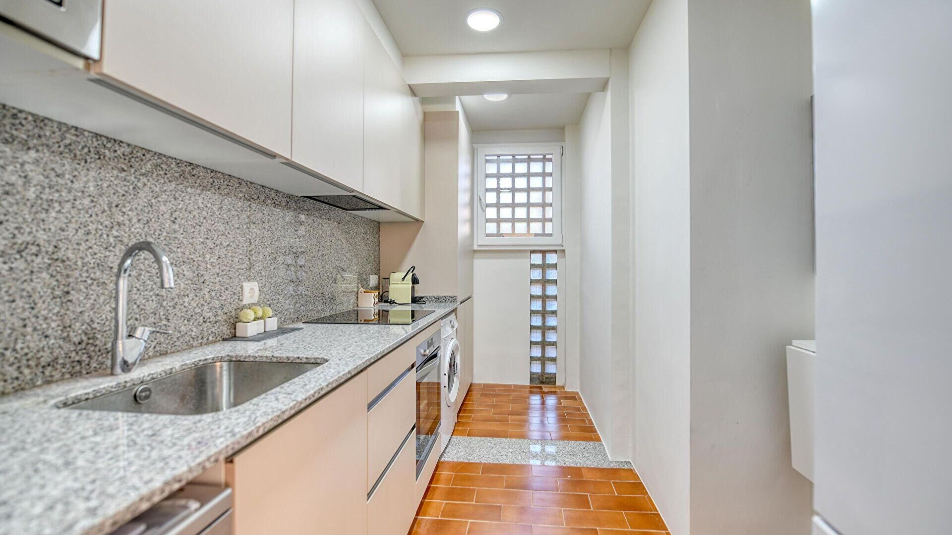 - Cuisine avec four, réfrigérateur, lave-vaisselle, machine à laver et plaque de cuisson vitrocéramique.