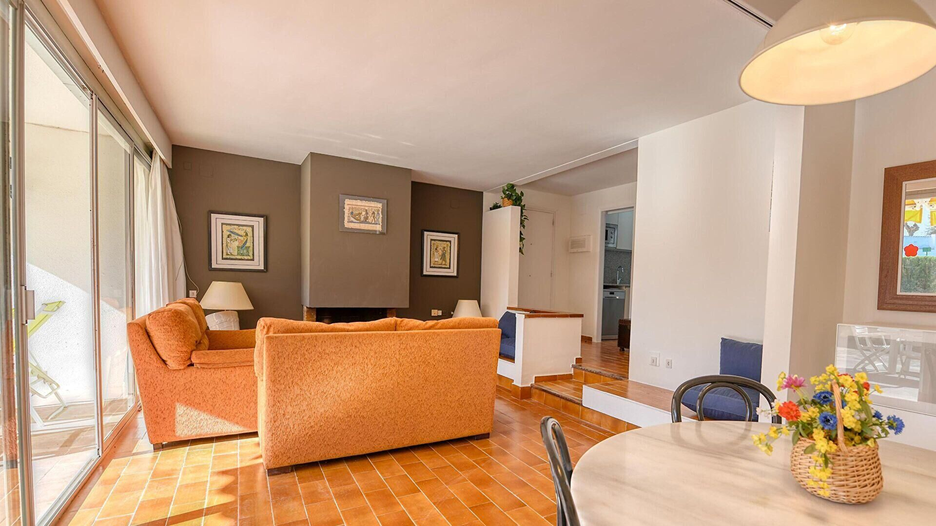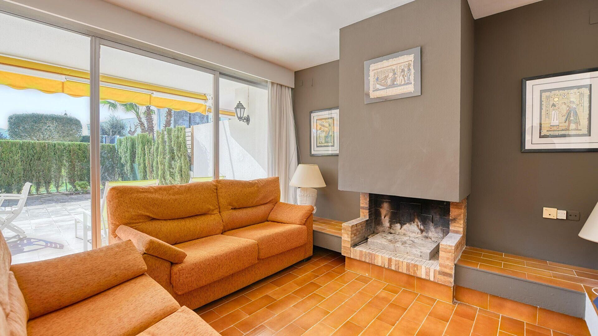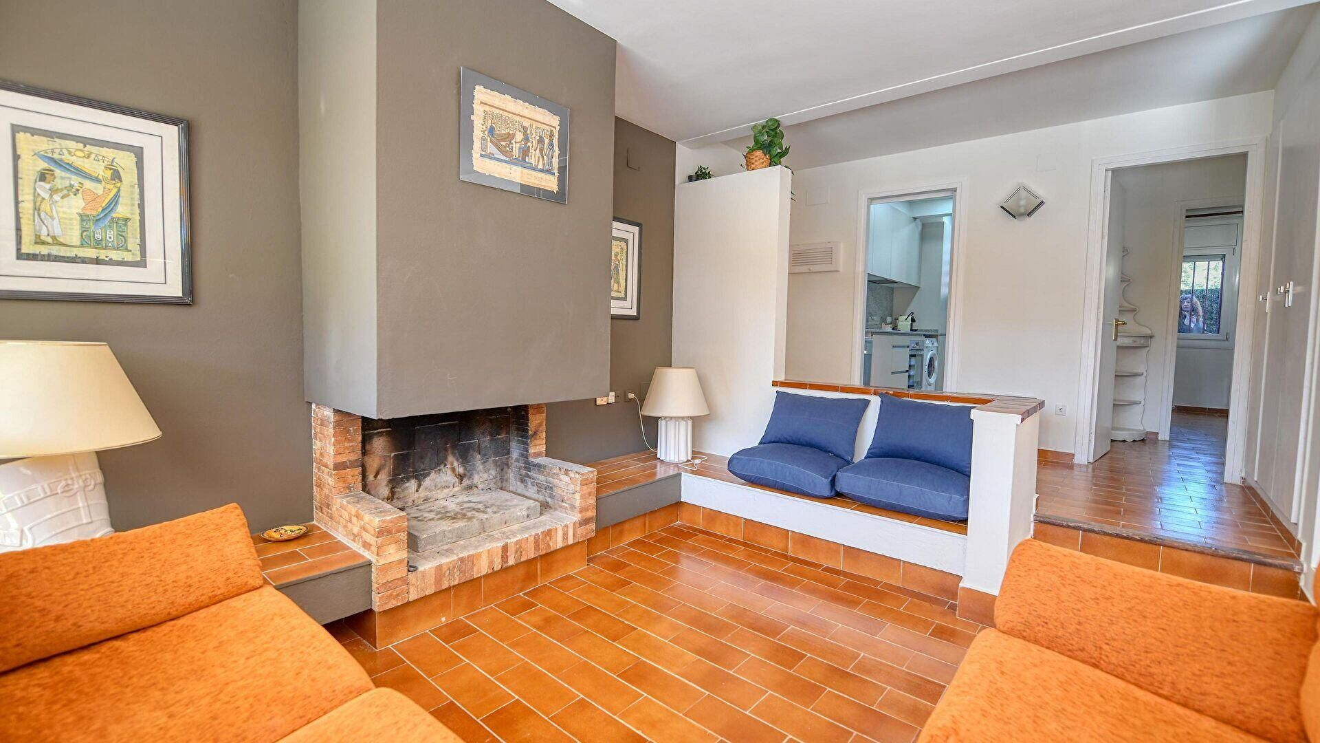- Salle de séjour, cheminée, téléviseur, sortie sur la terrasse, sortie au jardin privé et radiateur électrique.