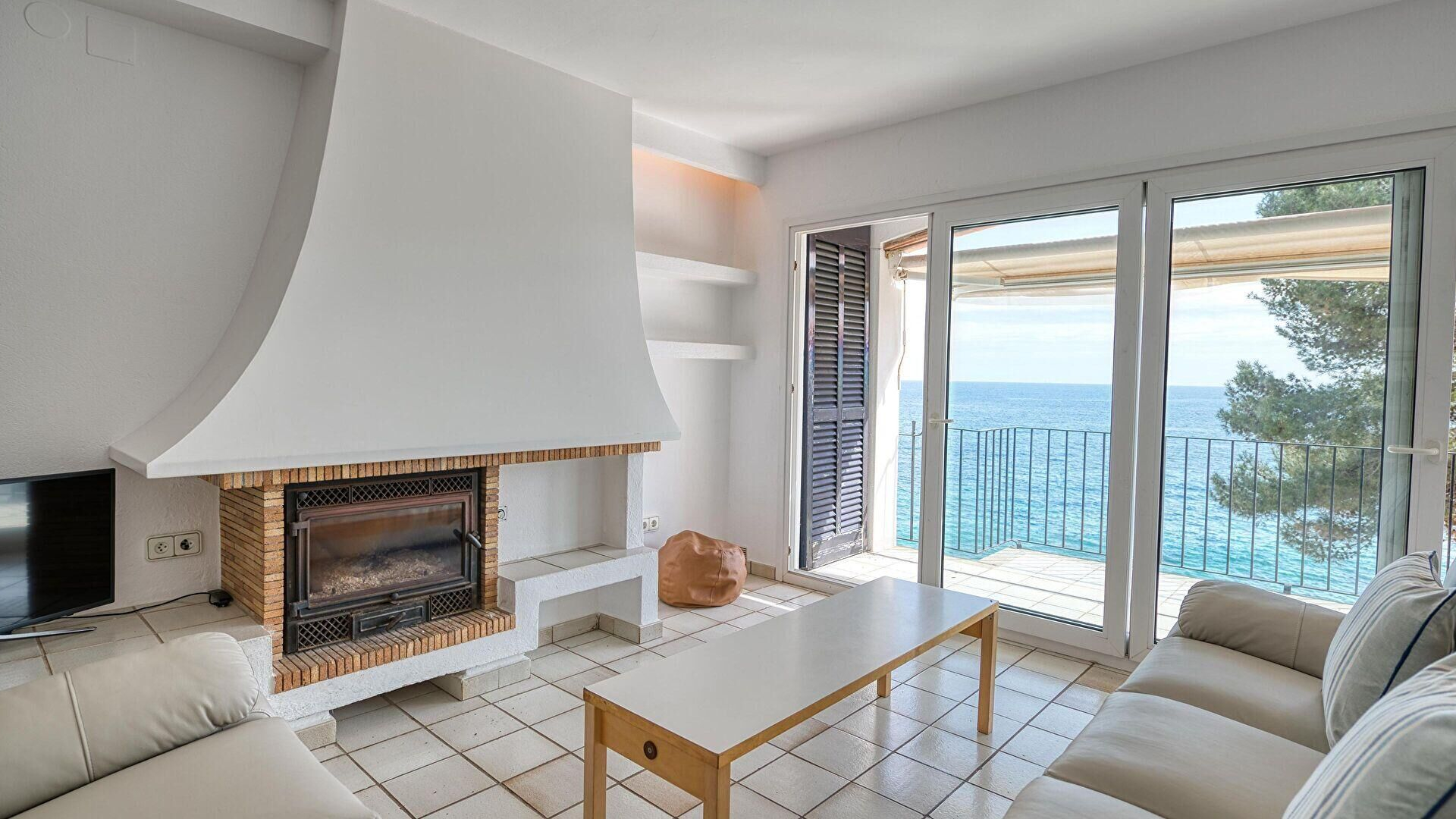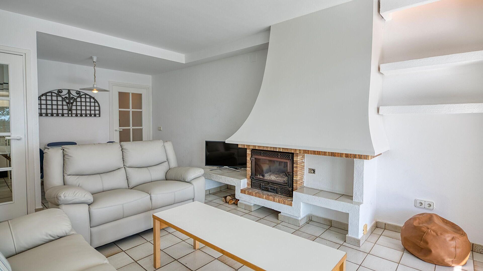 - Salle de séjour, cheminée, téléviseur et sortie sur la terrasse.