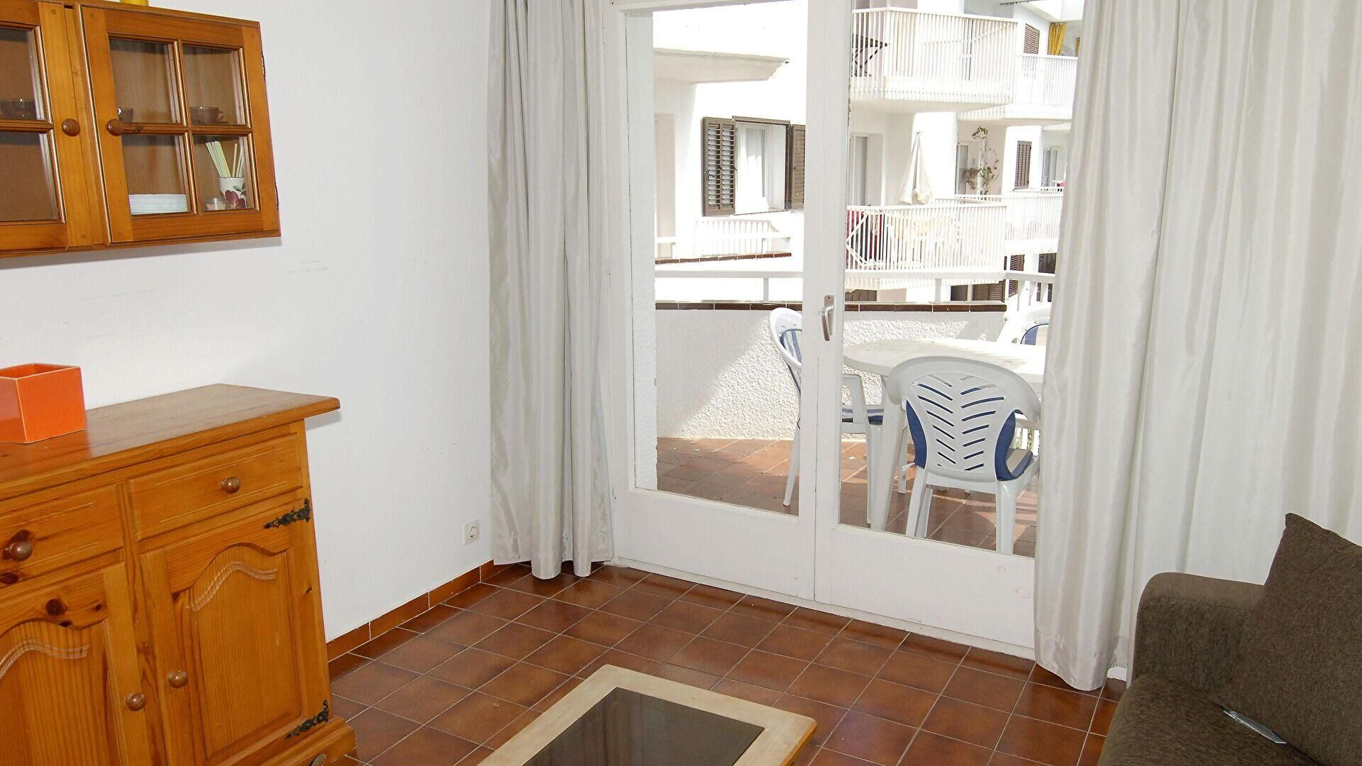 - Salle de séjour avec 1 canapé-lit pour 2 personnes, cheminée, téléviseur et sortie sur la terrasse.