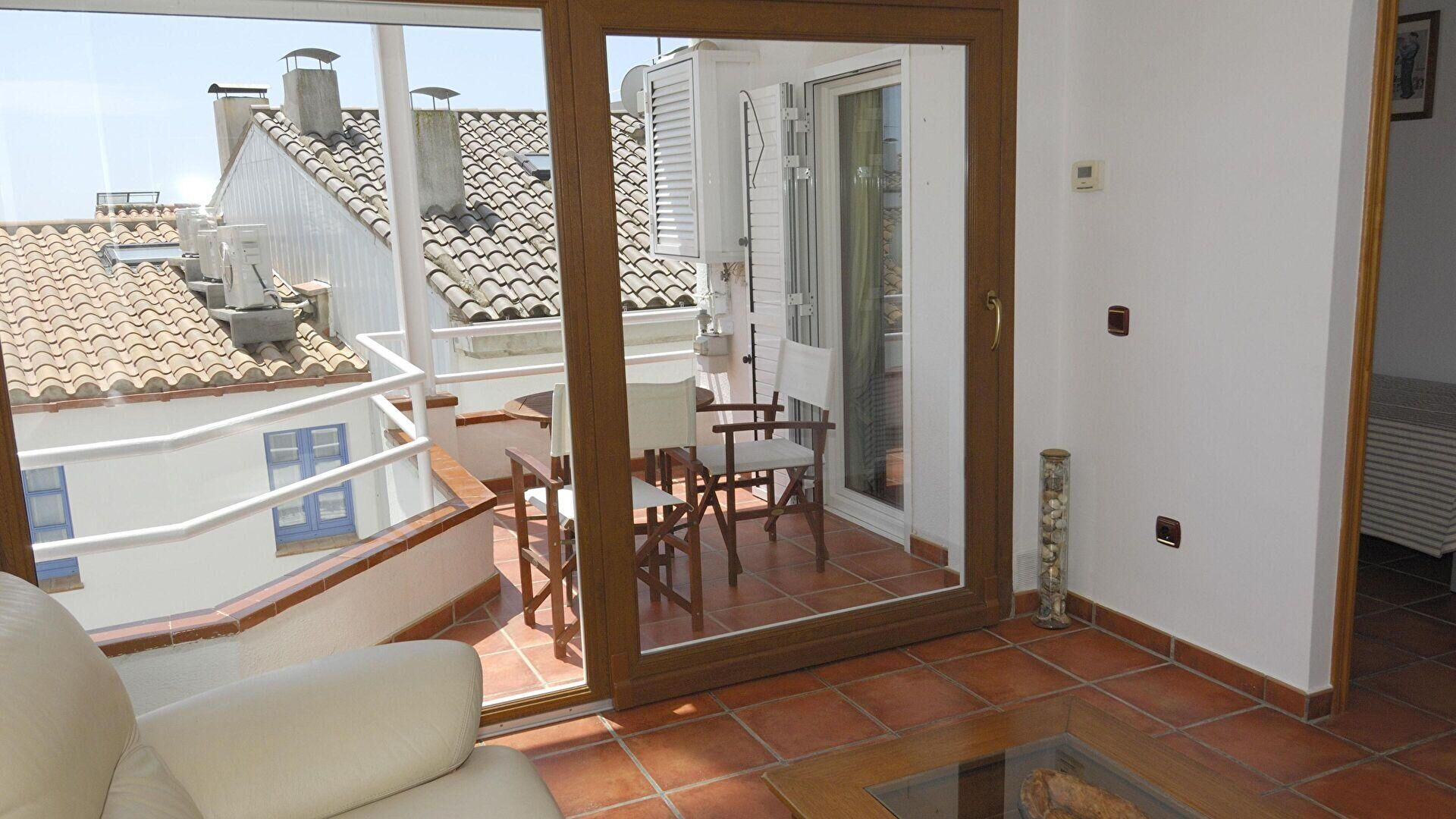 - Salle de séjour, sortie sur la terrasse et téléviseur.