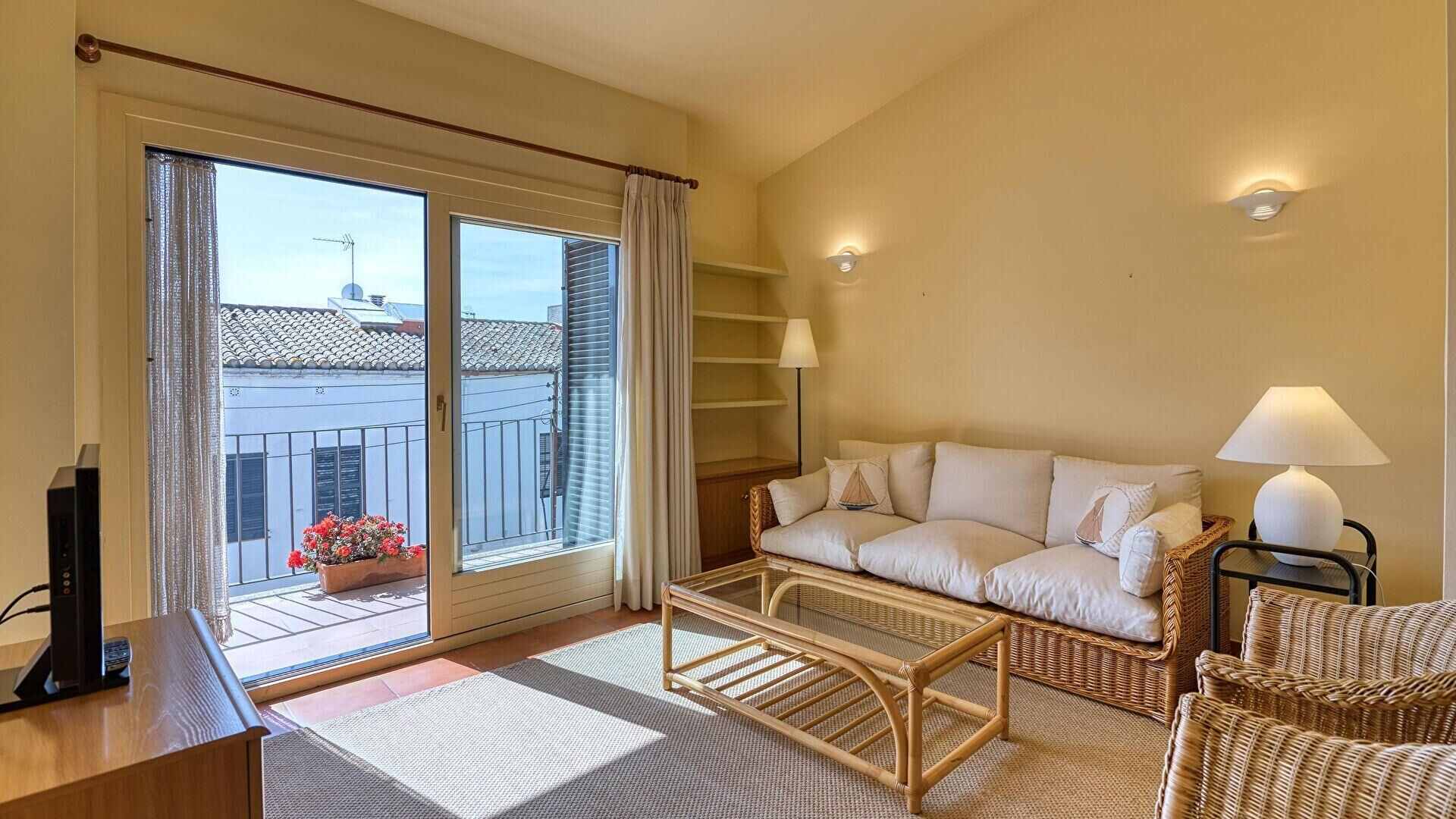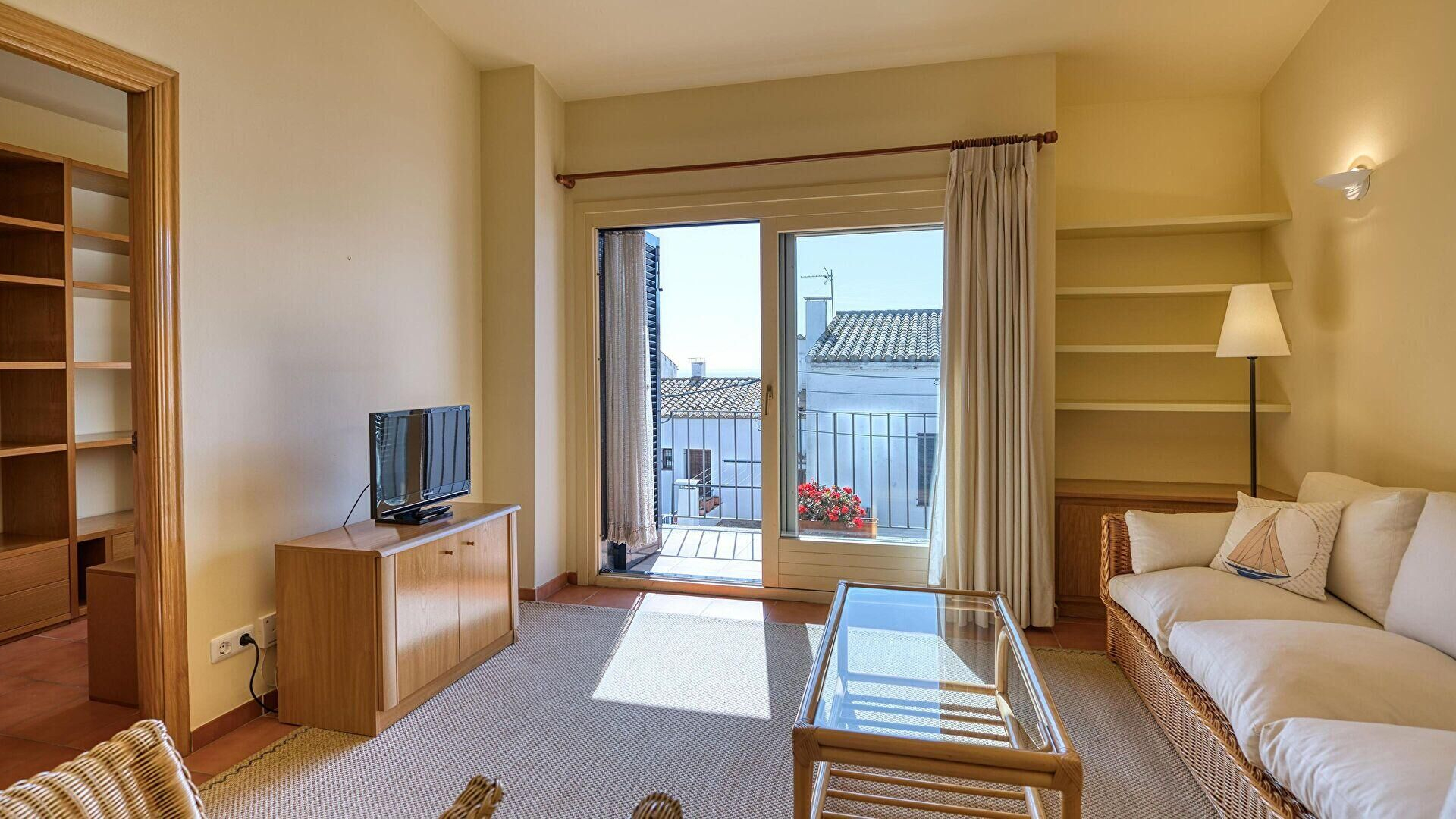 - Salle de séjour, téléviseur et sortie sur le balcon.
