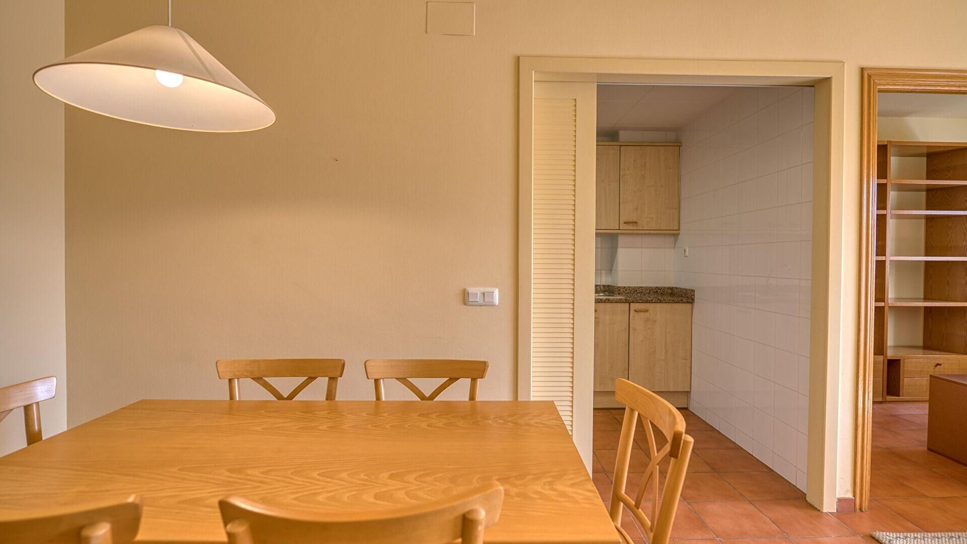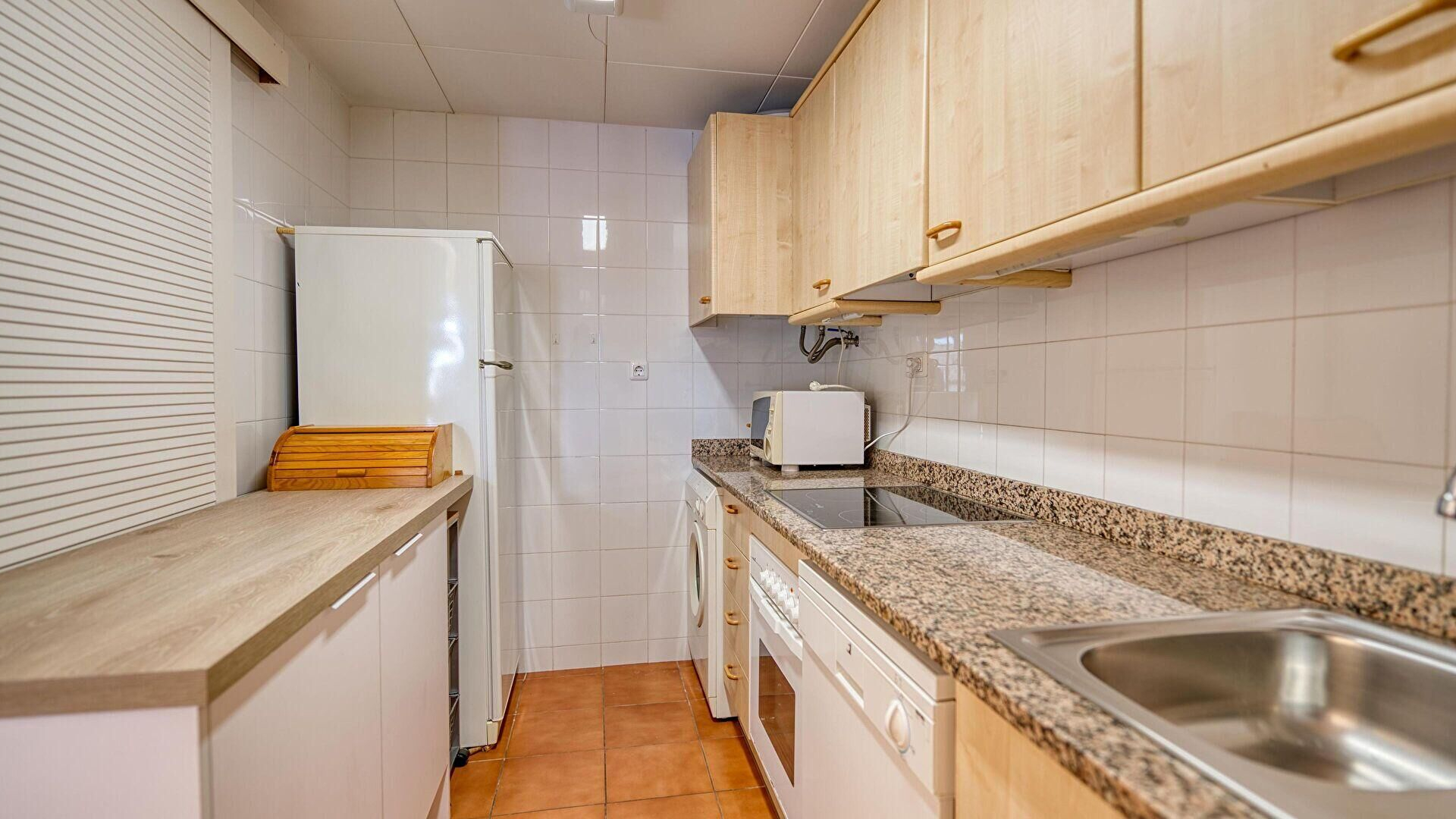 - Cuisine avec plaque de cuisson électrique, four, réfrigérateur, lave-vaisselle, machine à laver et sèche-linge.