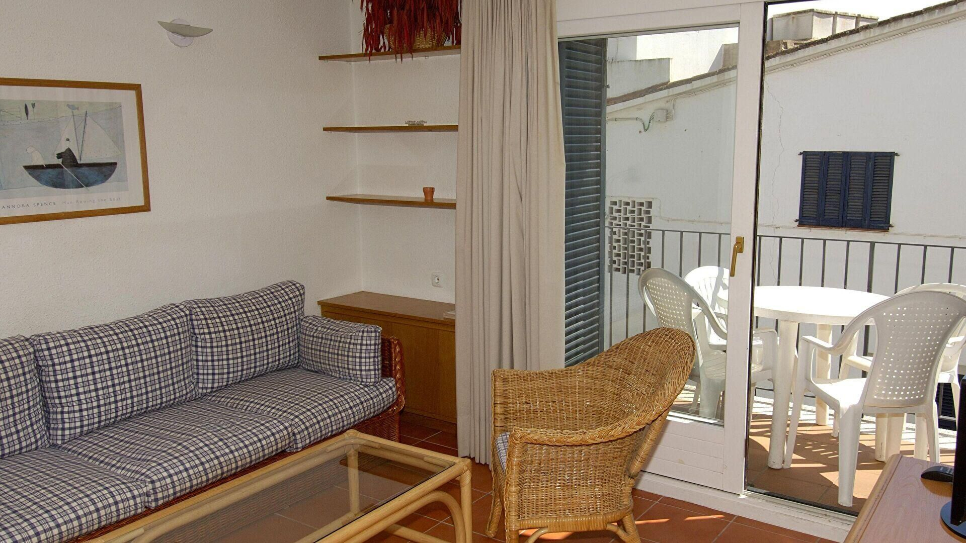 - Salle de séjour, téléviseur, sortie sur la terrasse et radiateur électrique.