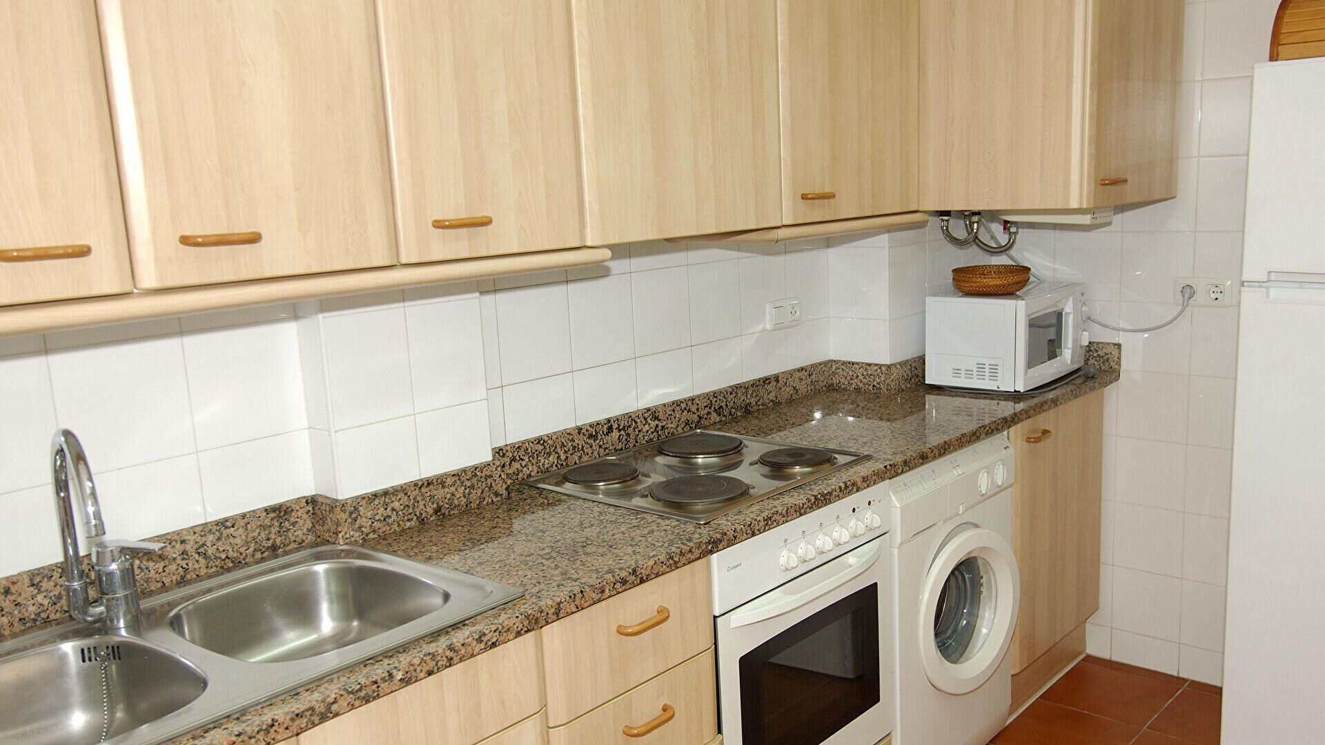 - Cuisine américaine avec four, micro-ondes, réfrigérateur, machine à laver et plaque de cuisson électrique.