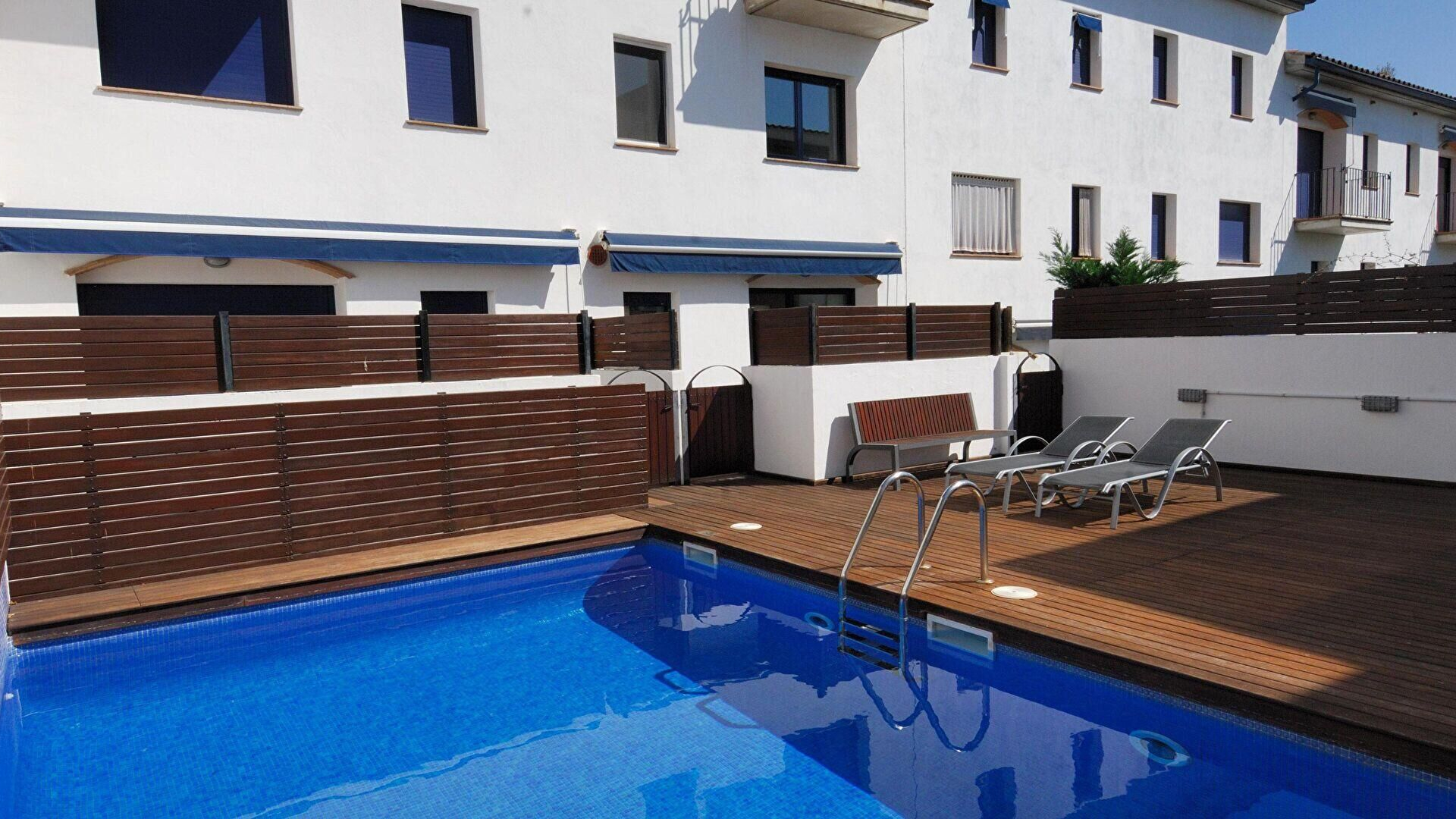 Piscine communautaire, meubles de terrasse et store électrique.