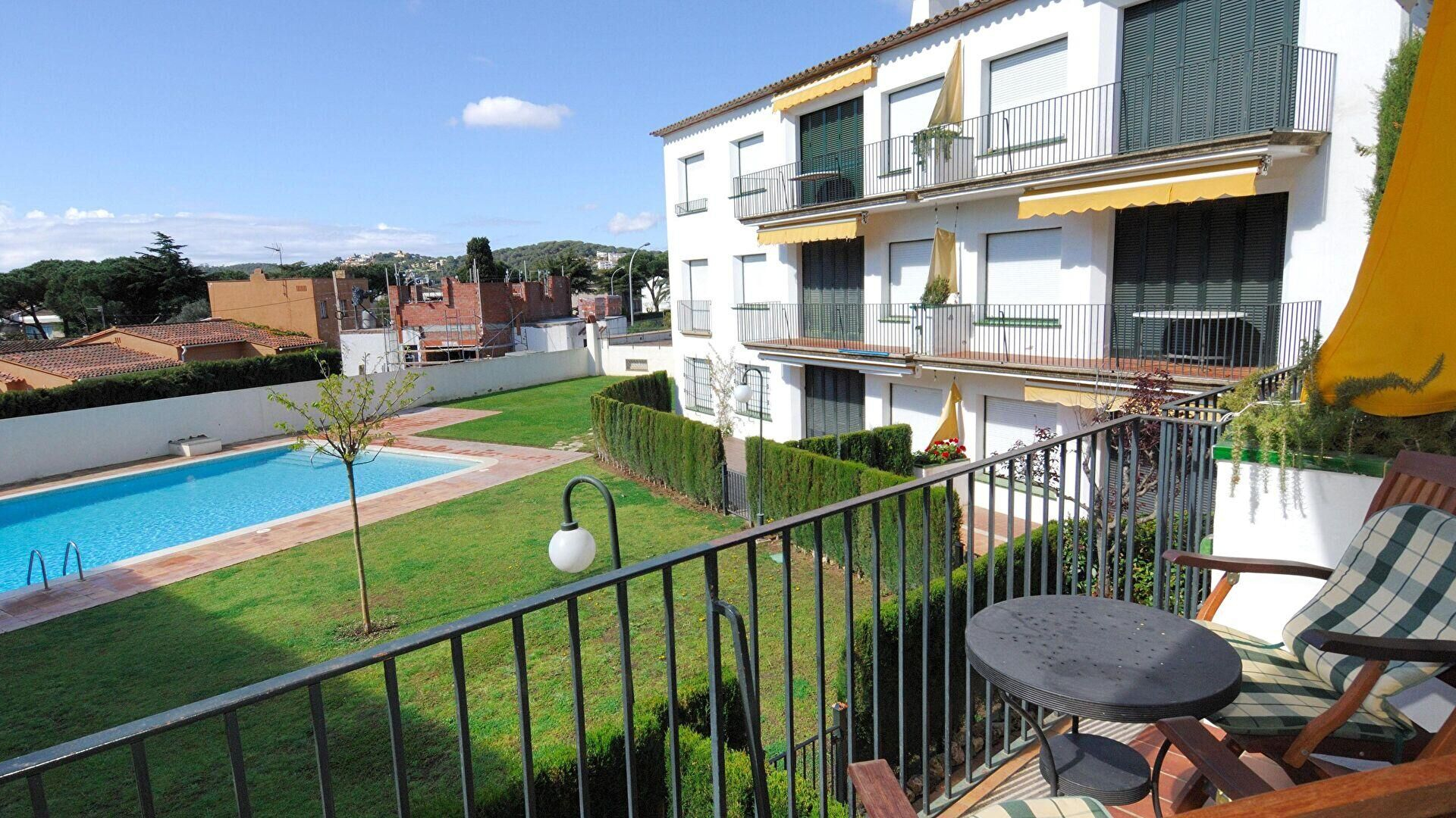 Jardin communautaire, piscine communautaire et meubles de terrasse.