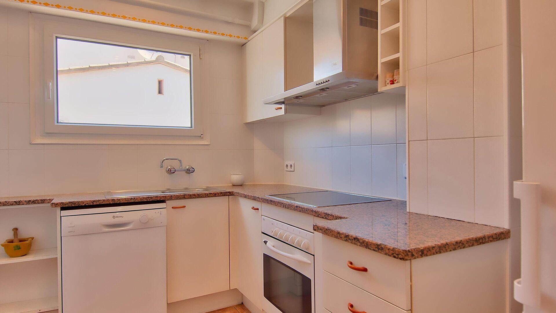 - Cuisine avec four, réfrigérateur, machine à laver et plaque de cuisson vitrocéramique.