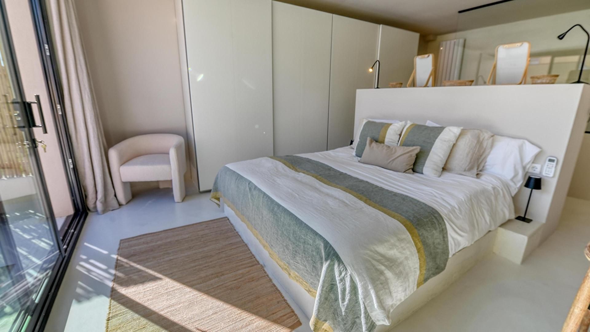Étage 1- Chambre avec 1 lit double, salle de bain (en suite) et sortie sur la terrasse-solarium.