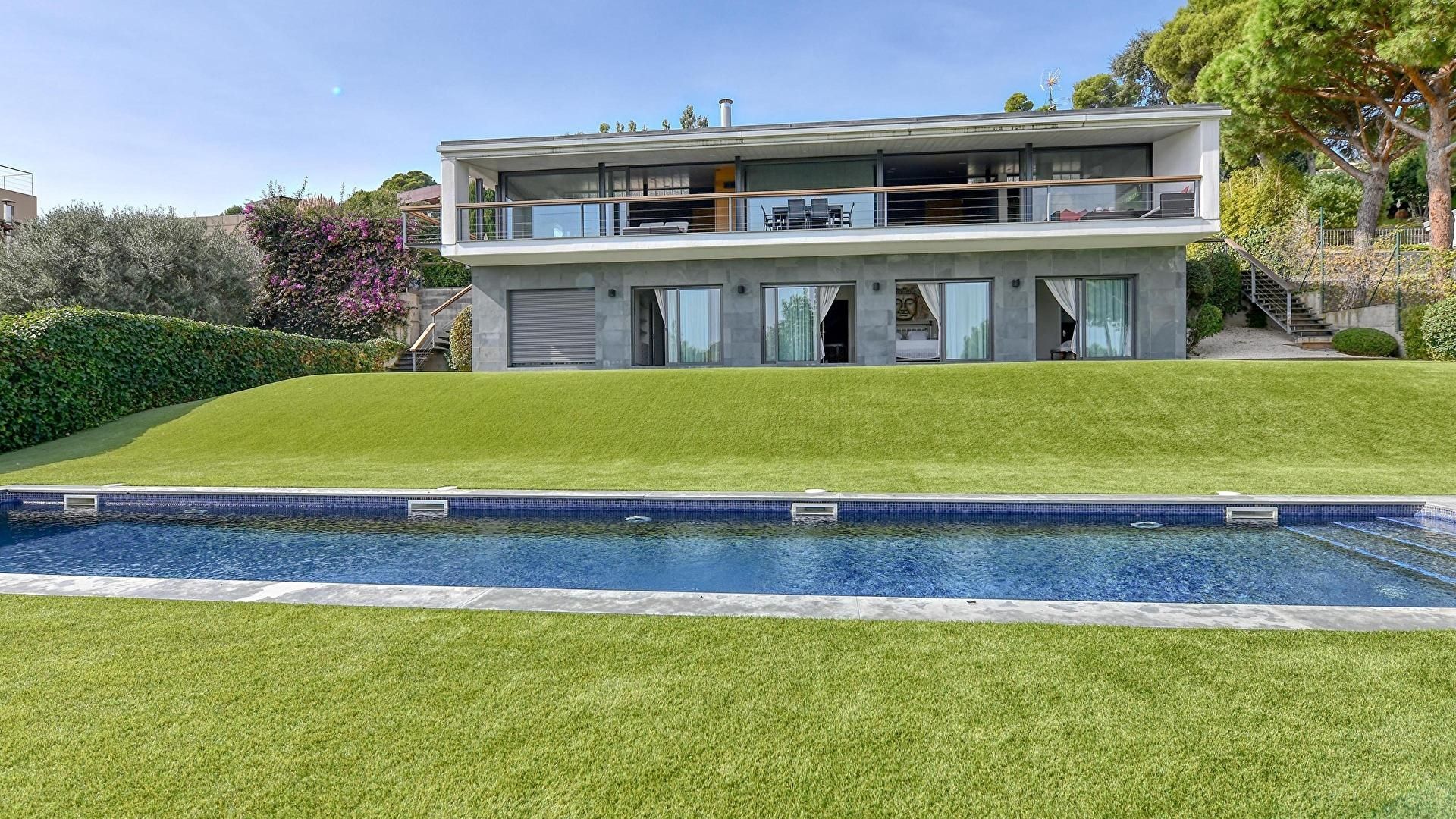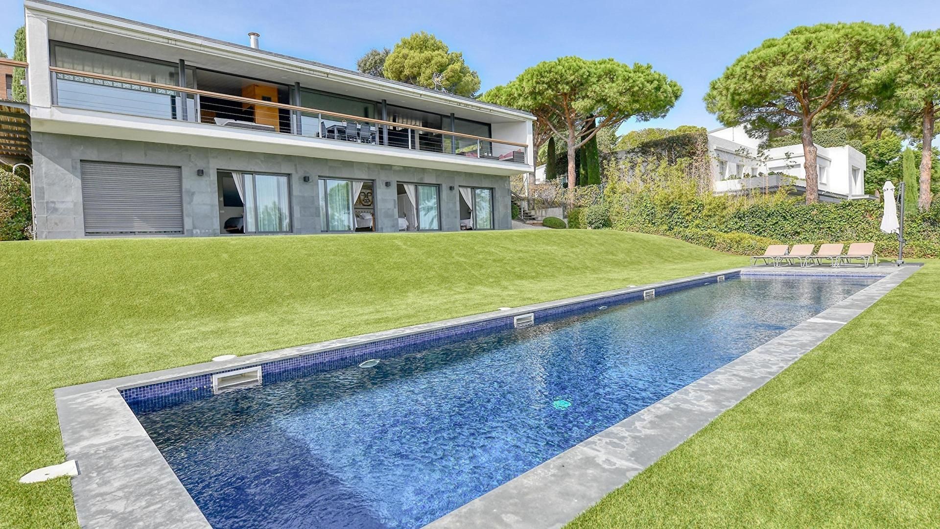 Jardin avec piscine, salle de séjour, cuisine, 5 chambres et 4 salles de bain avec douche.