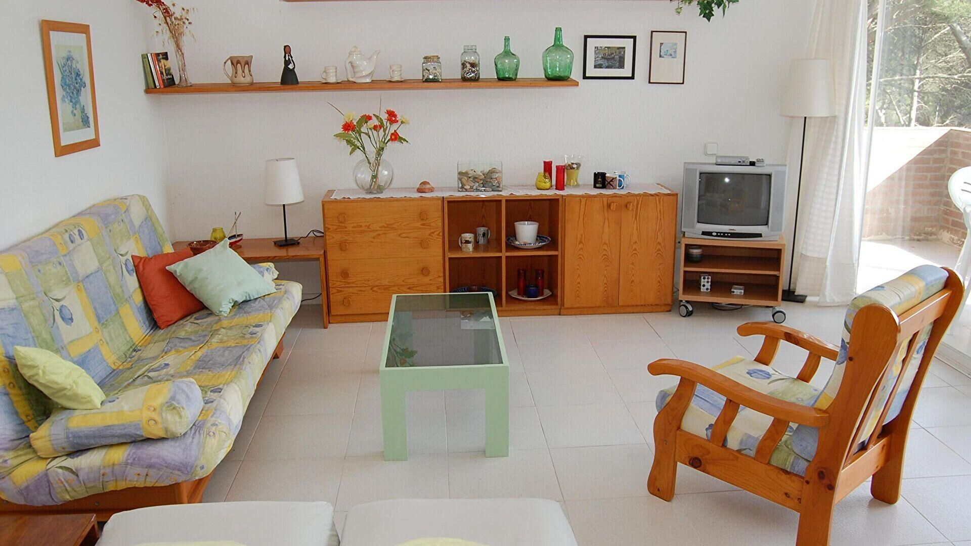- Salle de séjour avec téléviseur et sortie sur la terrasse.