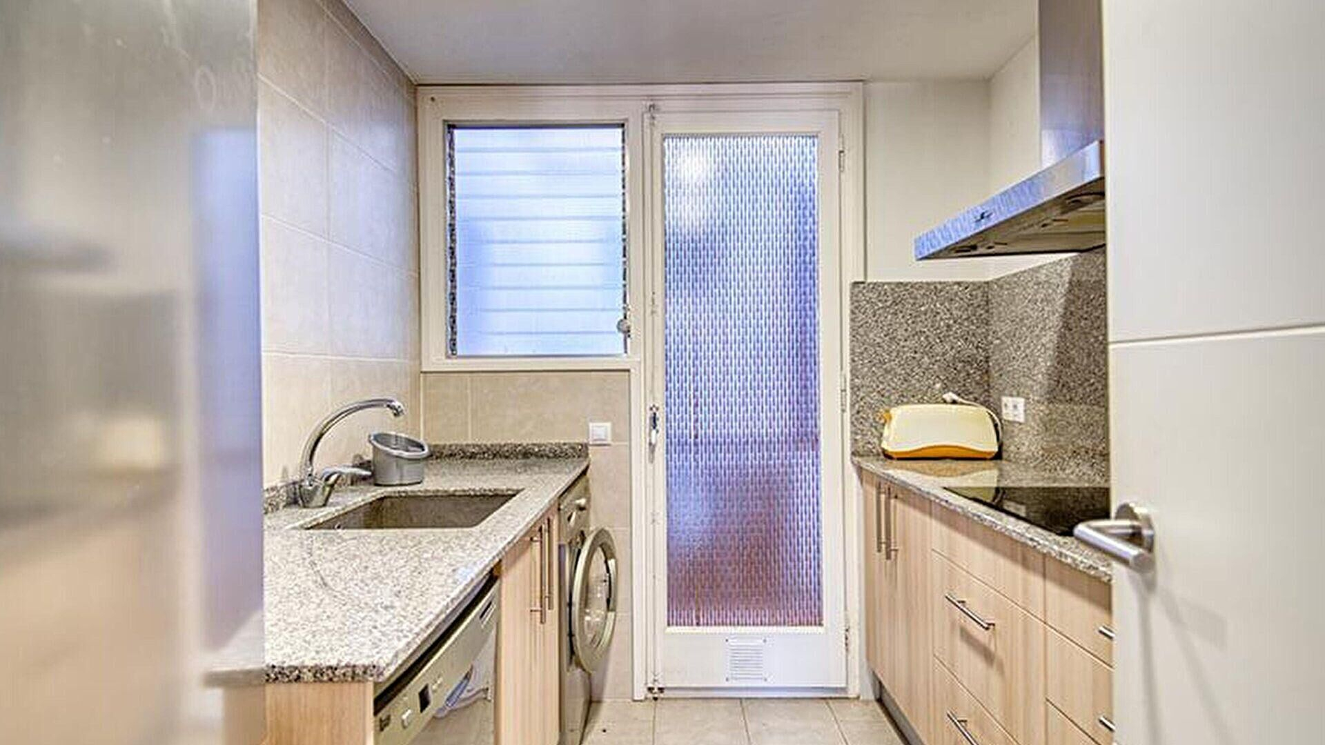 - Cuisine avec plaque de cuisson vitrocéramique, four, micro-ondes, réfrigérateur combi, lave-vaisselle, machine à laver et sortie sur le balcon.