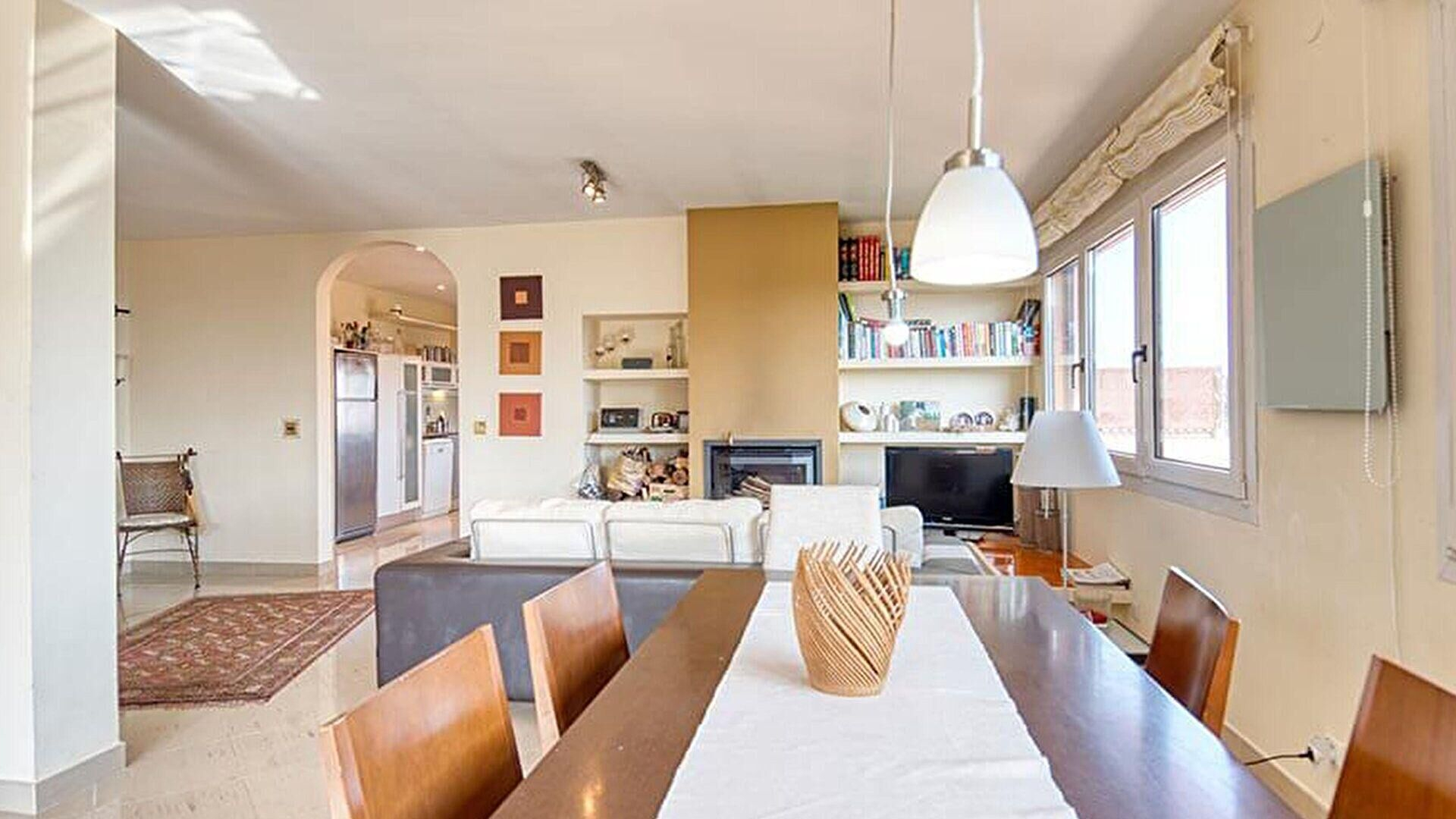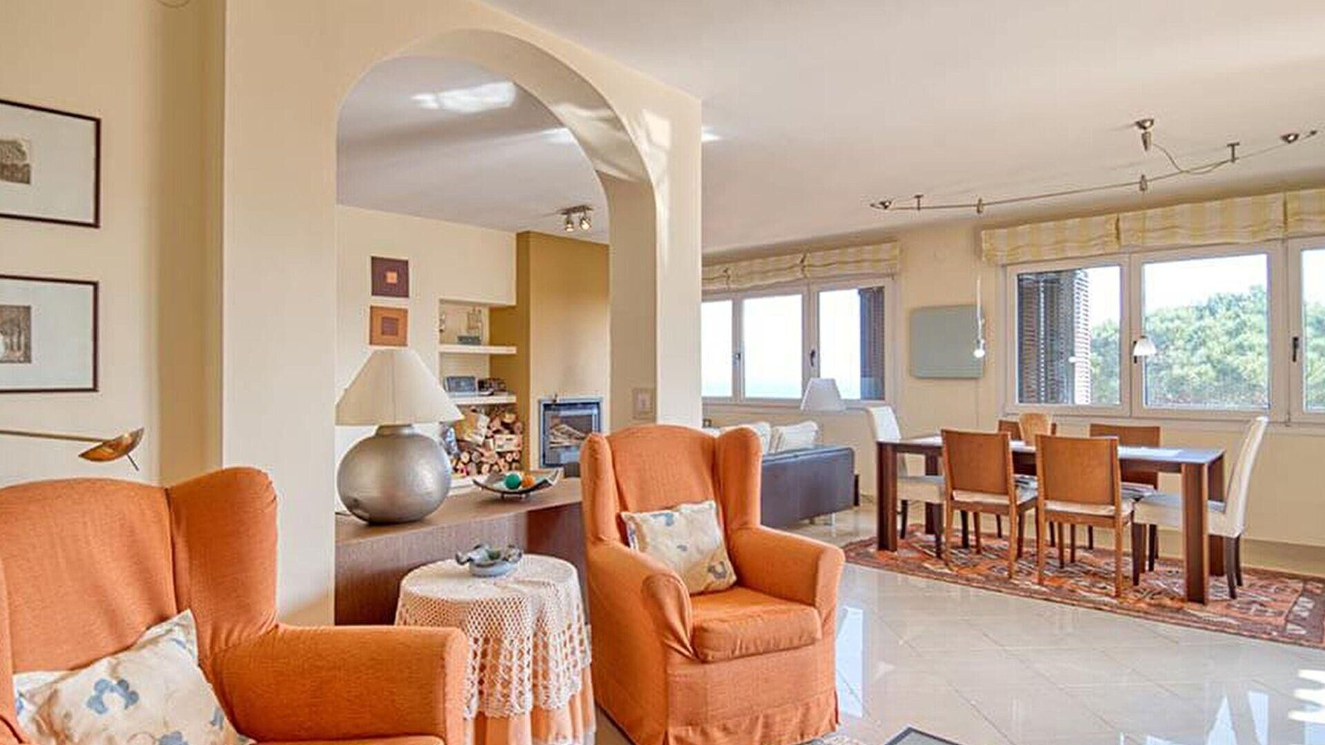 - Salle de séjour avec téléviseur, cheminée, sortie sur la terrasse et vue sur la mer.