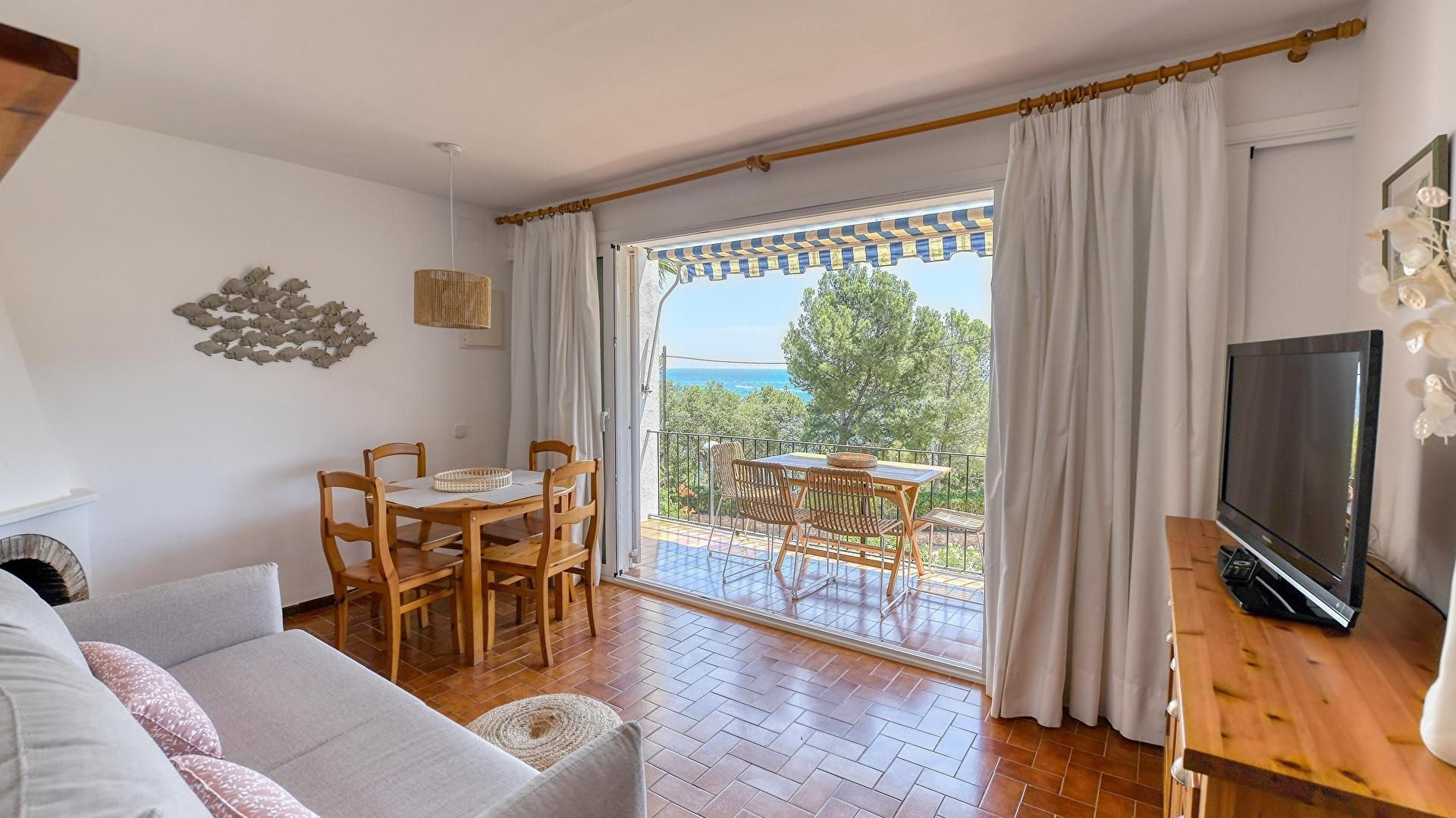 - Salle de séjour avec 1 canapé-lit double, téléviseur et sortie sur la terrasse.