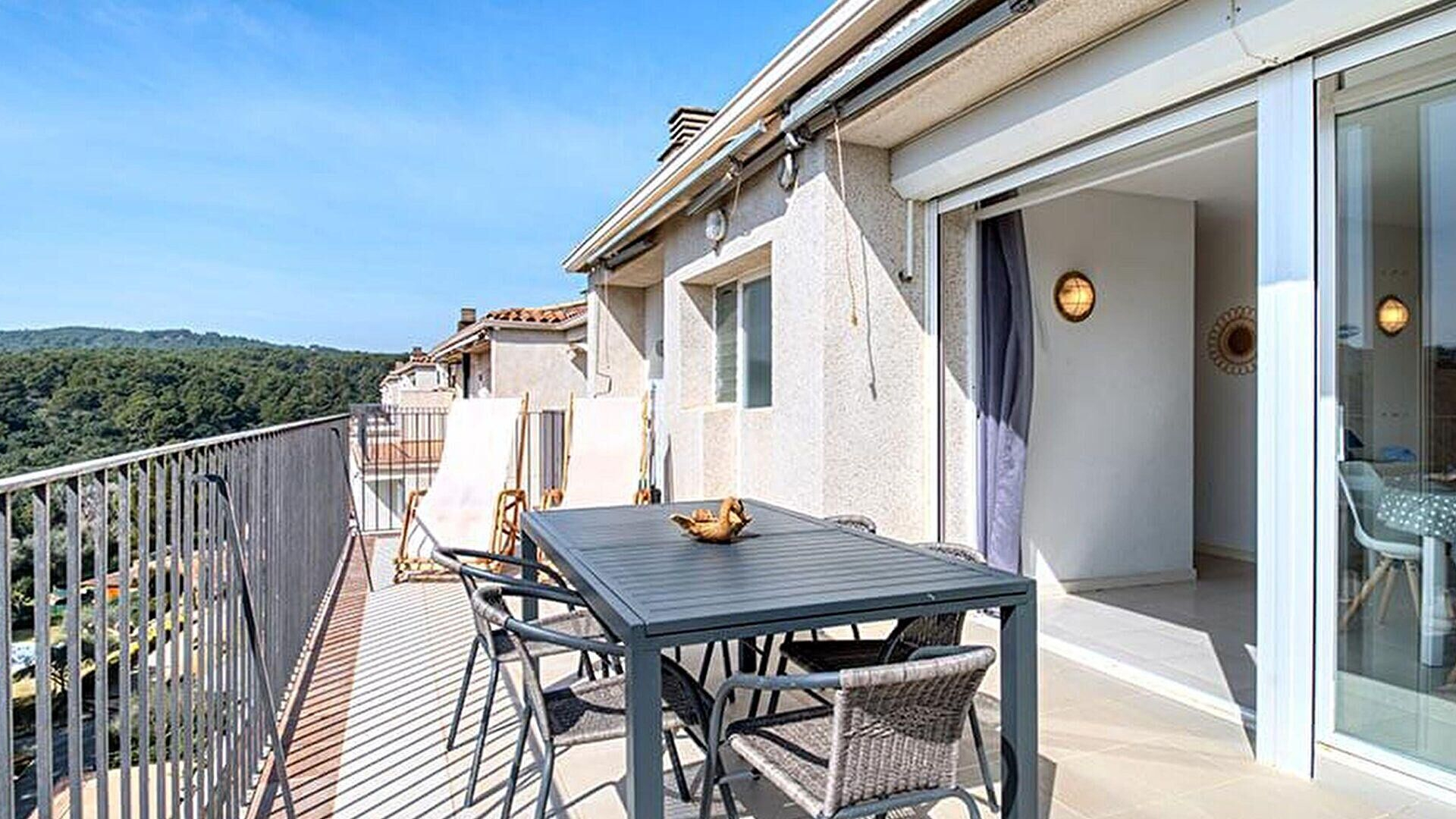 - Terrasse avec vue sur la mer et store.