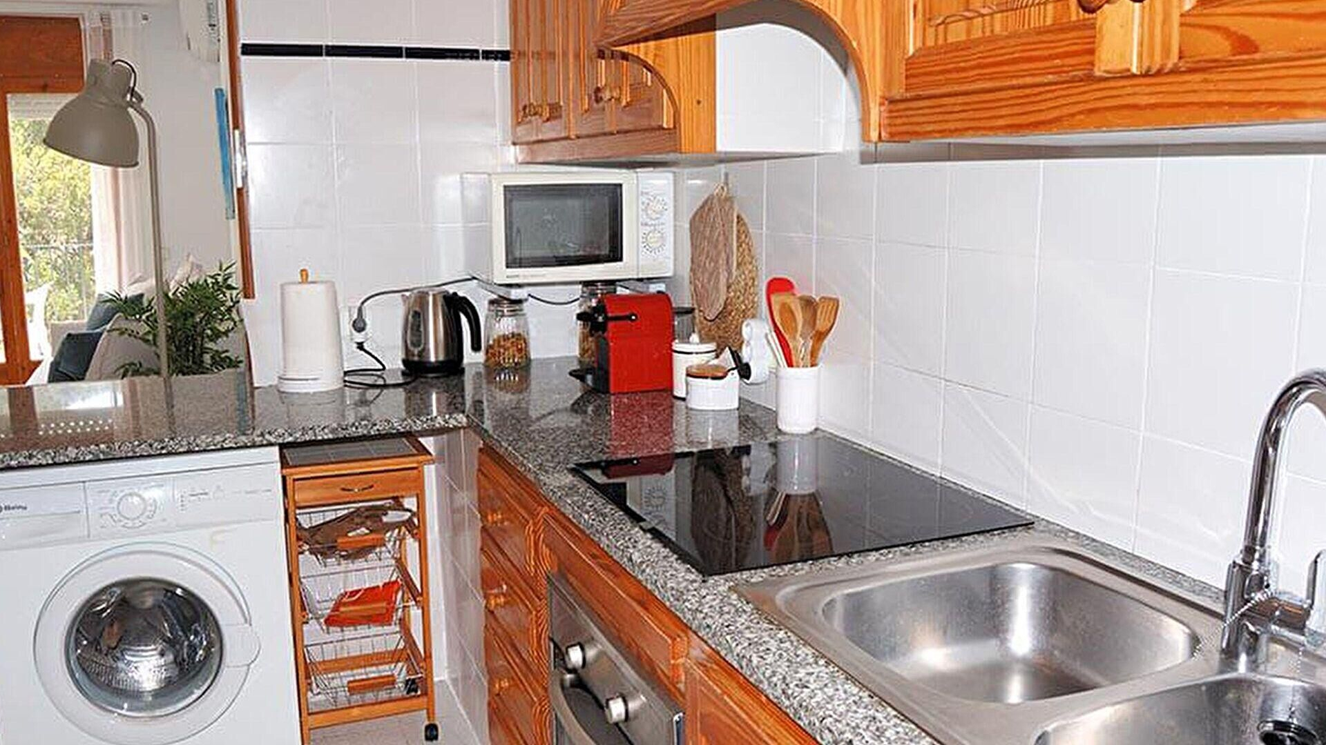 - Cuisine américaine avec four, micro-ondes, réfrigérateur combi, lave-vaisselle, machine à laver et plaque de cuisson vitrocéramique.