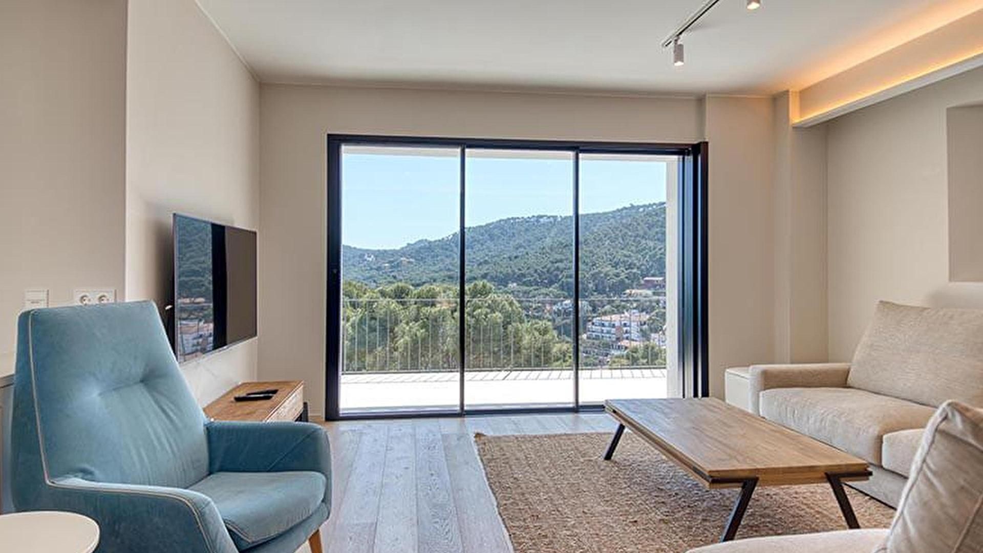 • Salon avec téléviseur, vue sur la mer et sortie sur la terrasse.