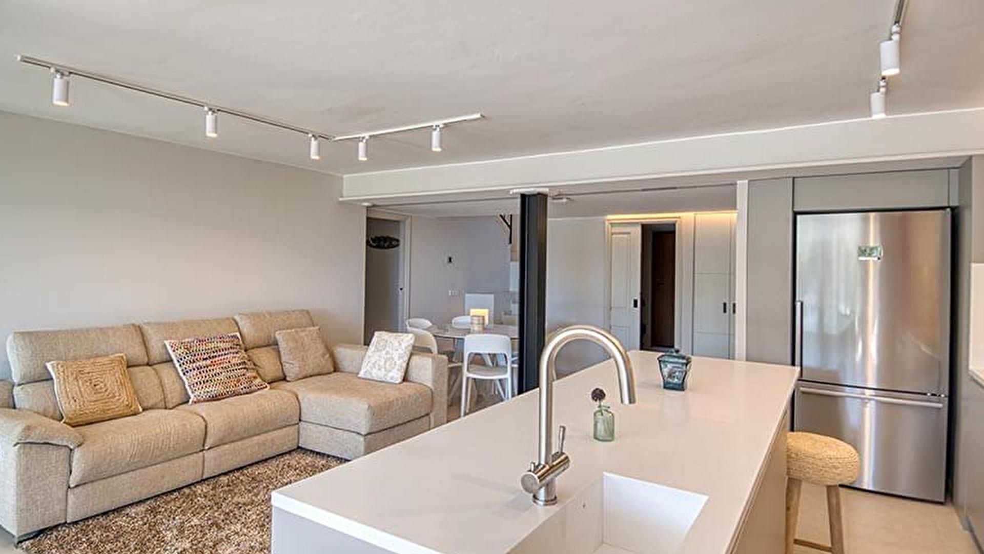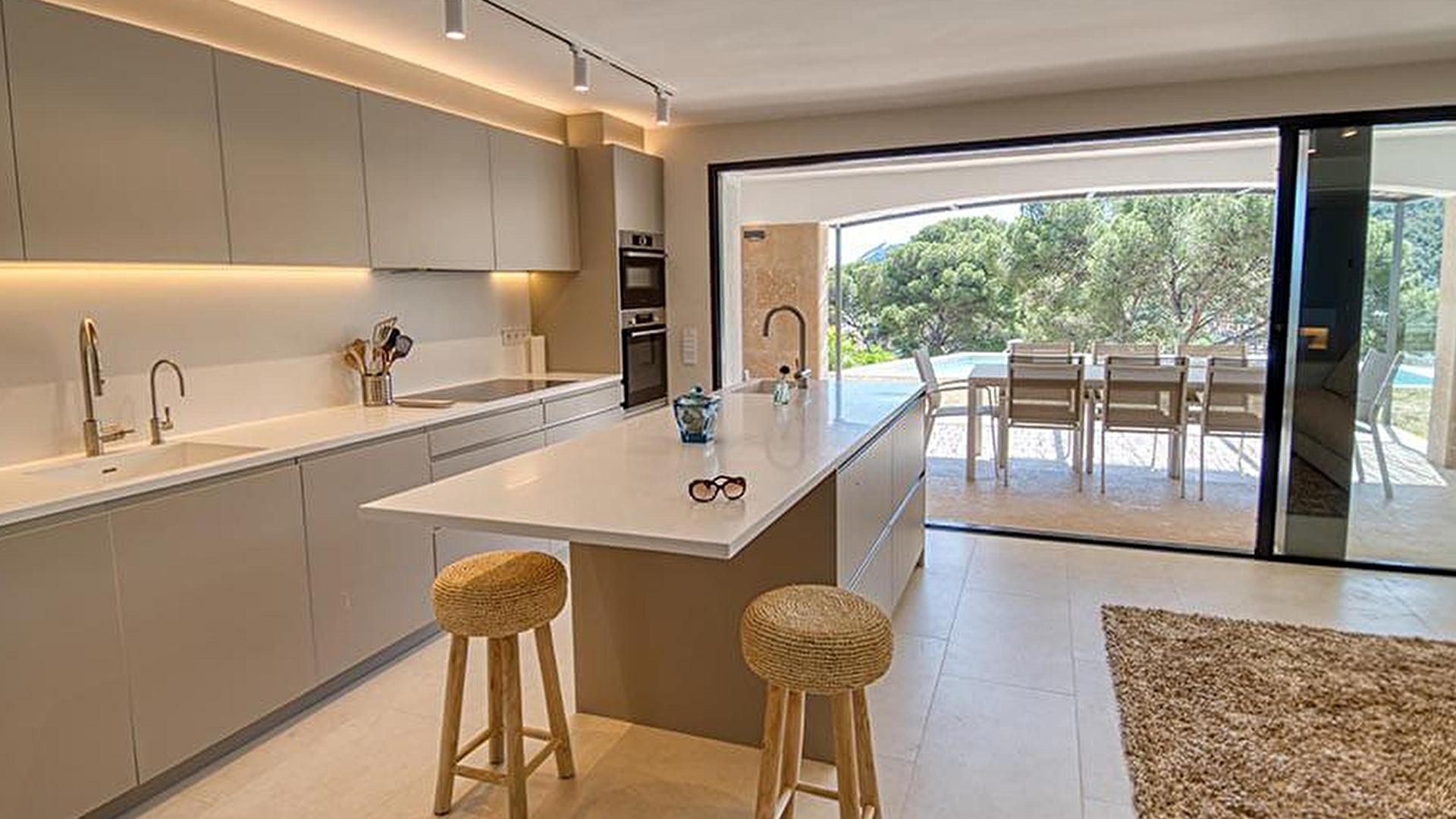 • Cuisine américaine avec plaque de cuisson à induction, four, sortie sur la terrasse, vue sur la mer, micro-ondes, lave-vaisselle et réfrigérateur combi.