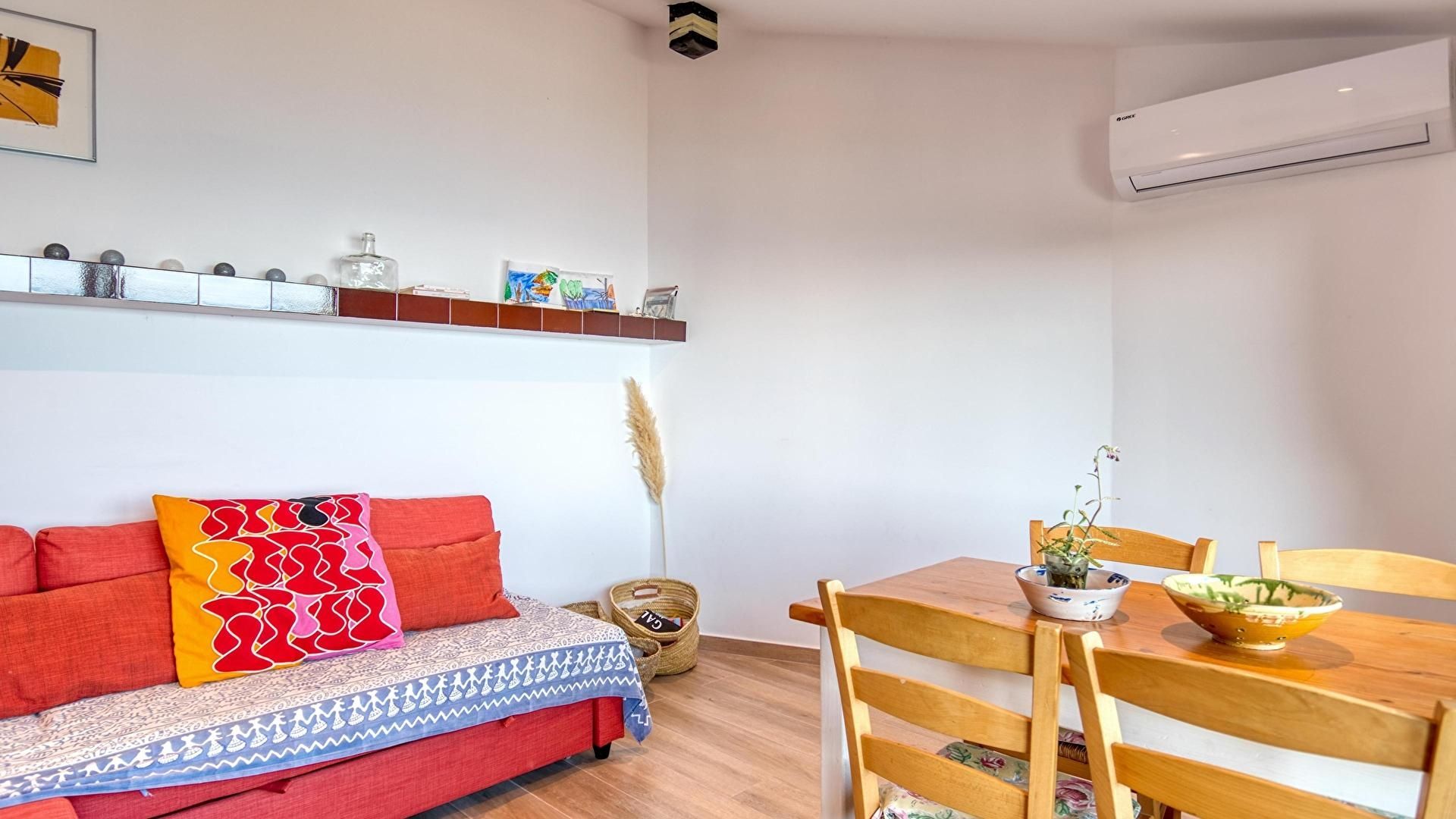 - Salle de séjour avec téléviseur, air conditionnée froid/chaud, vue sur la mer et sortie au jardin privé.