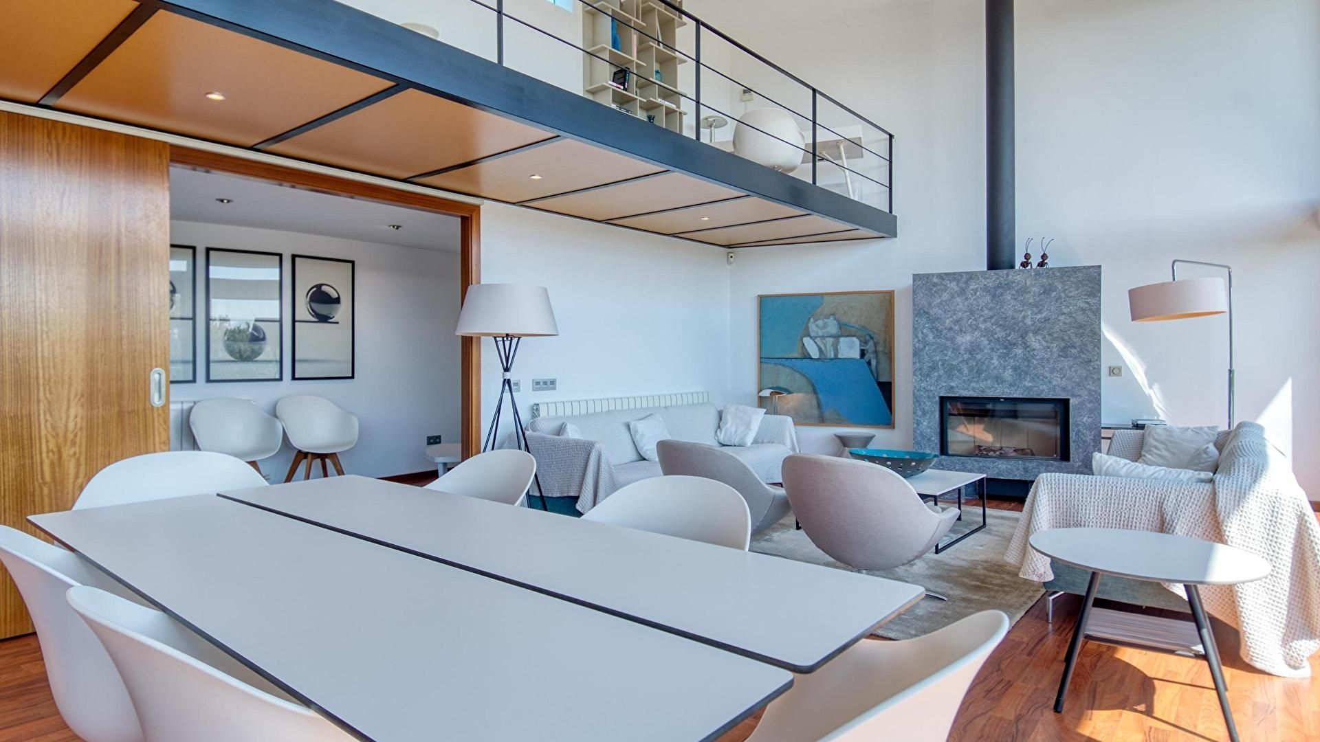 Étage 1- Salle de séjour avec terrasse, cheminée, sortie sur la terrasse, air conditionnée froid/chaud et vue sur la mer.