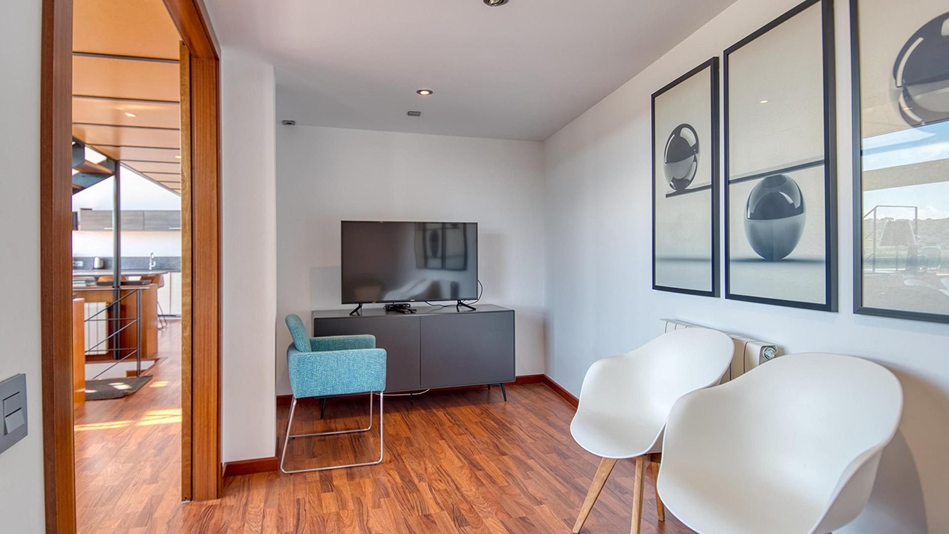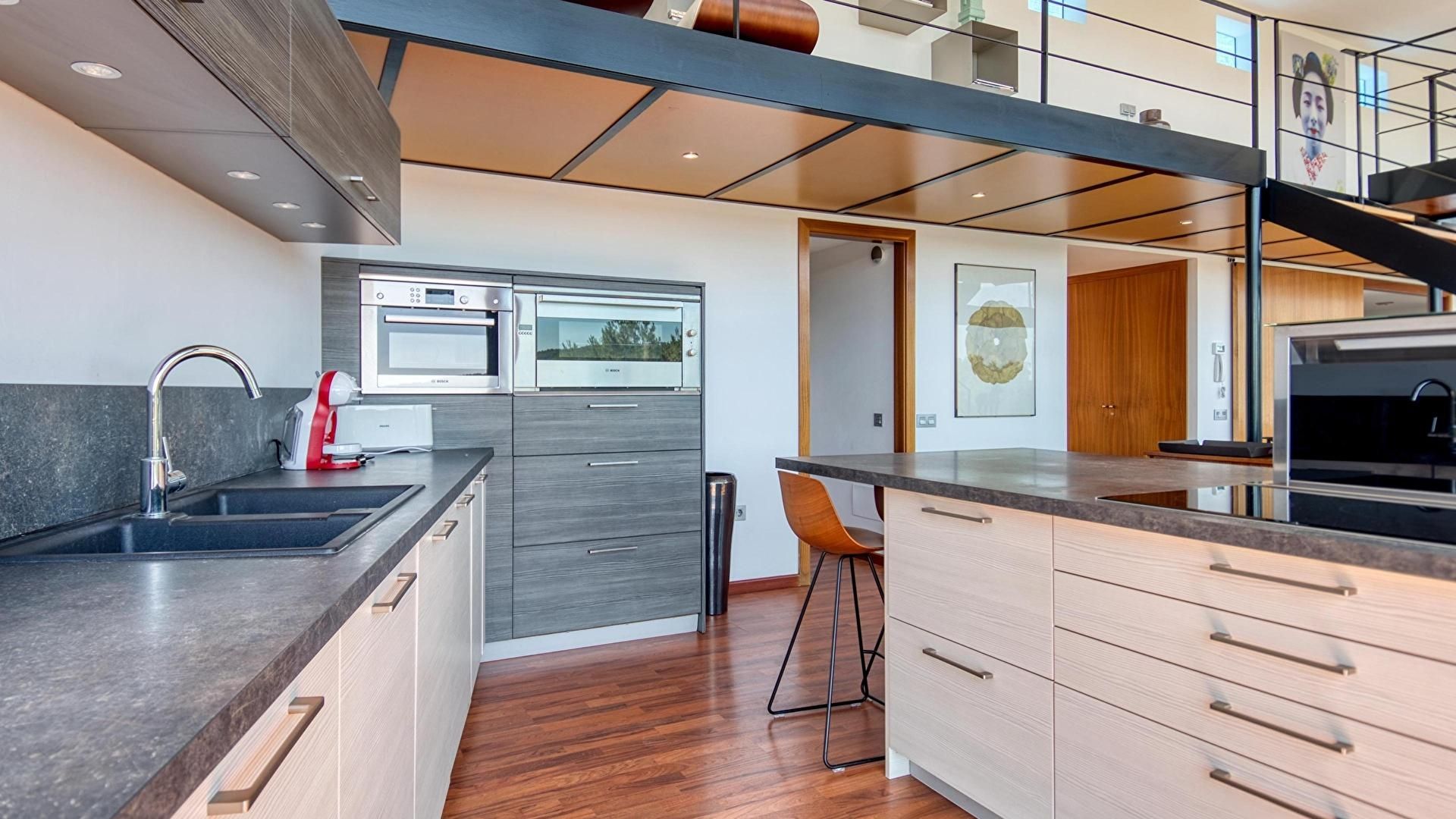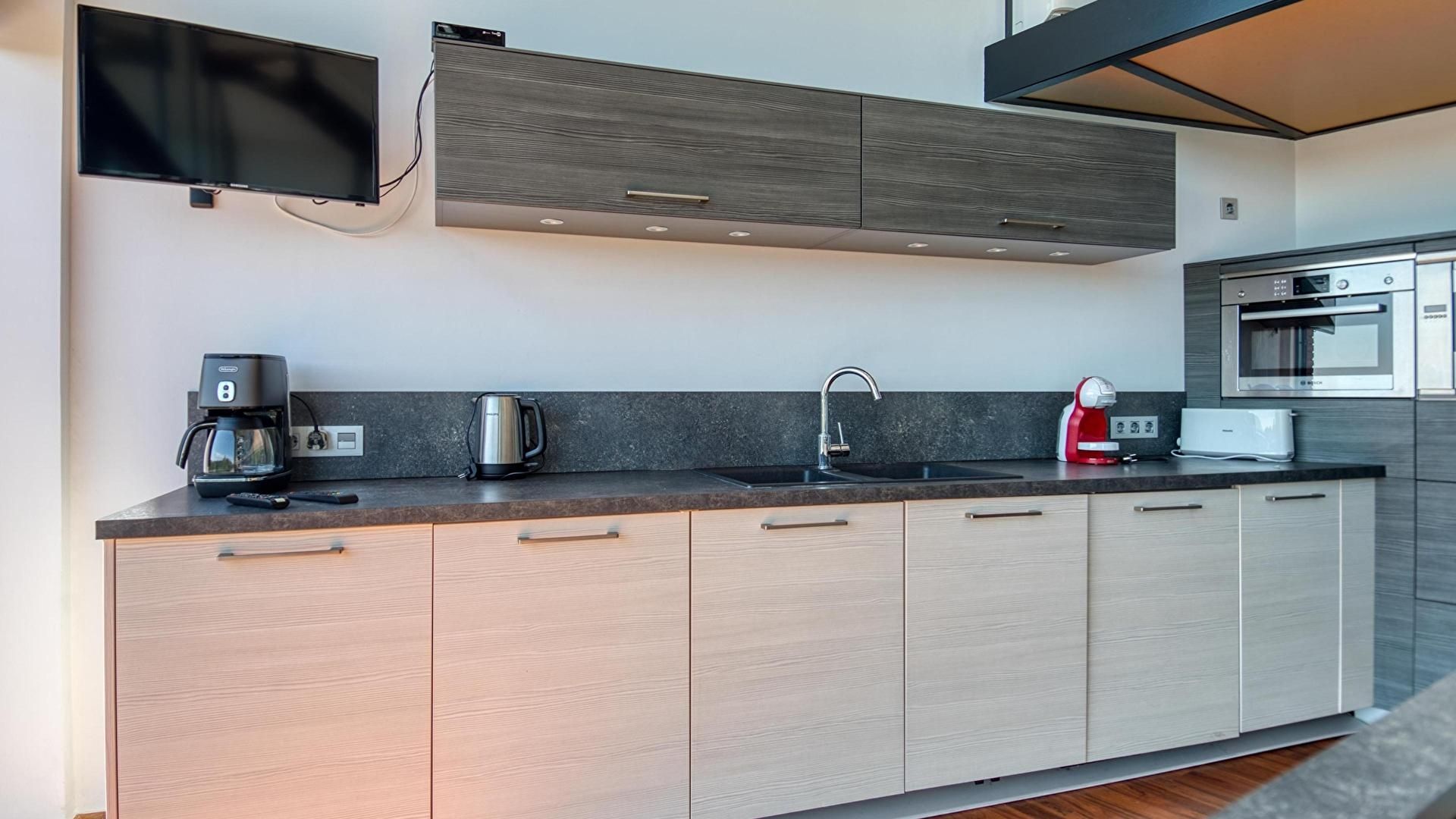 - Cuisine américaine avec téléviseur, plaque de cuisson vitrocéramique, réfrigérateur combi, lave-vaisselle, four, micro-ondes et sortie sur la terrasse.