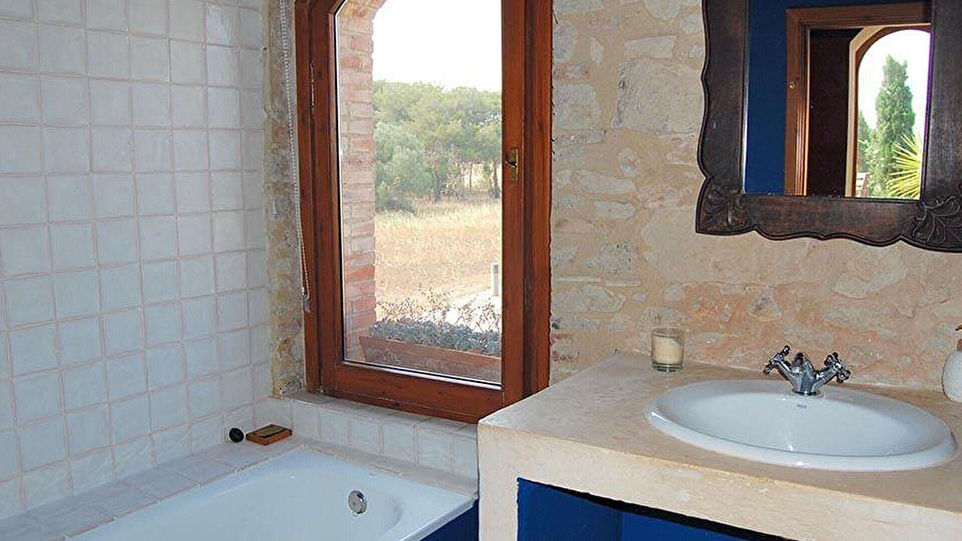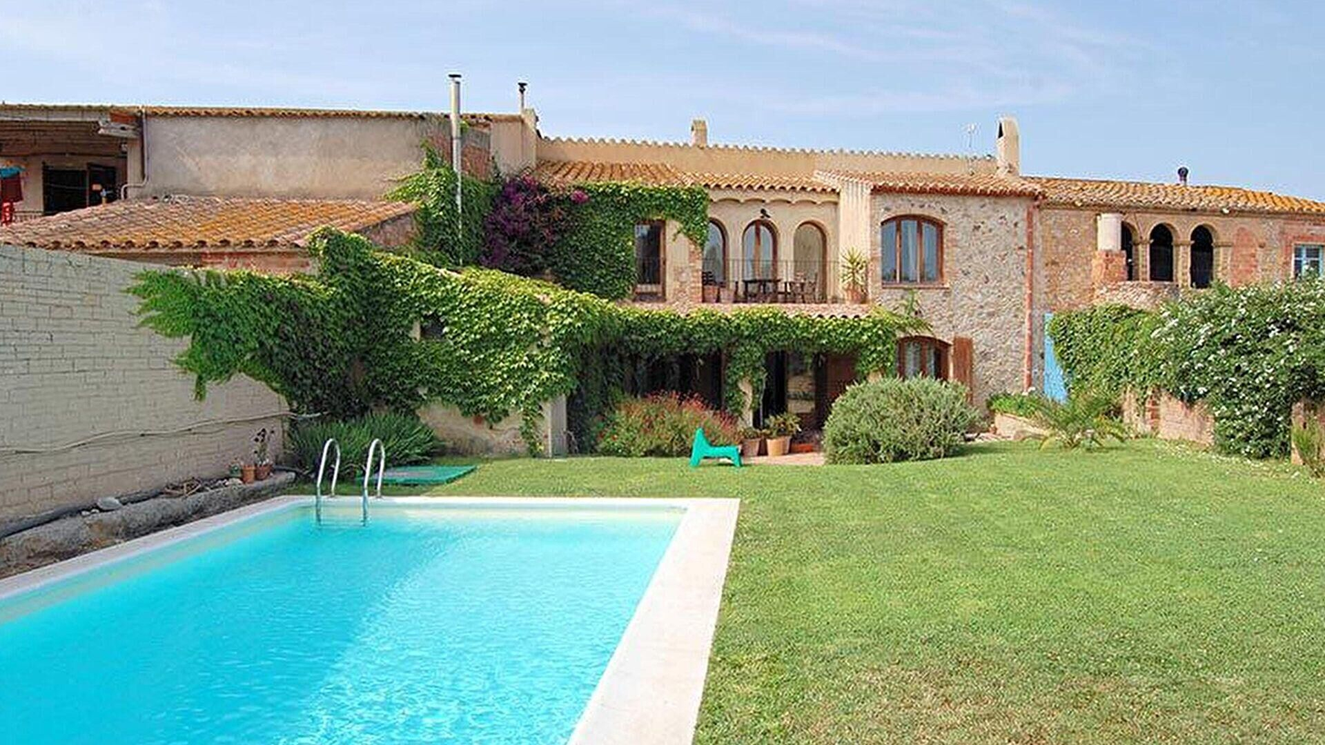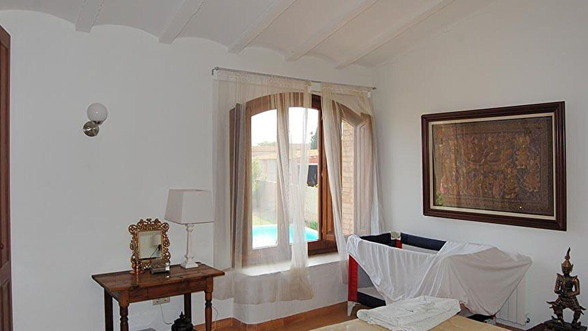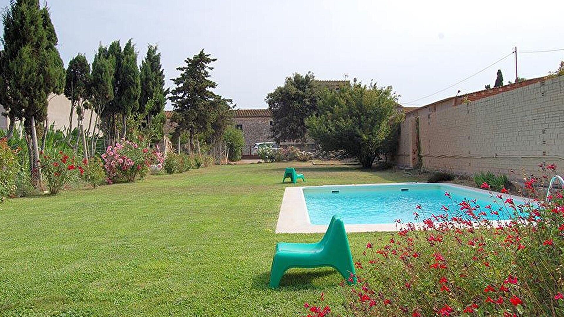 Garten mit Pool, Terrasse, Wohnzimmer-Esszimmer, Wohnzimmer, 4 Schlafzimmer, 2 Bäder mit Badewanne, 1 Toilette und Büro.