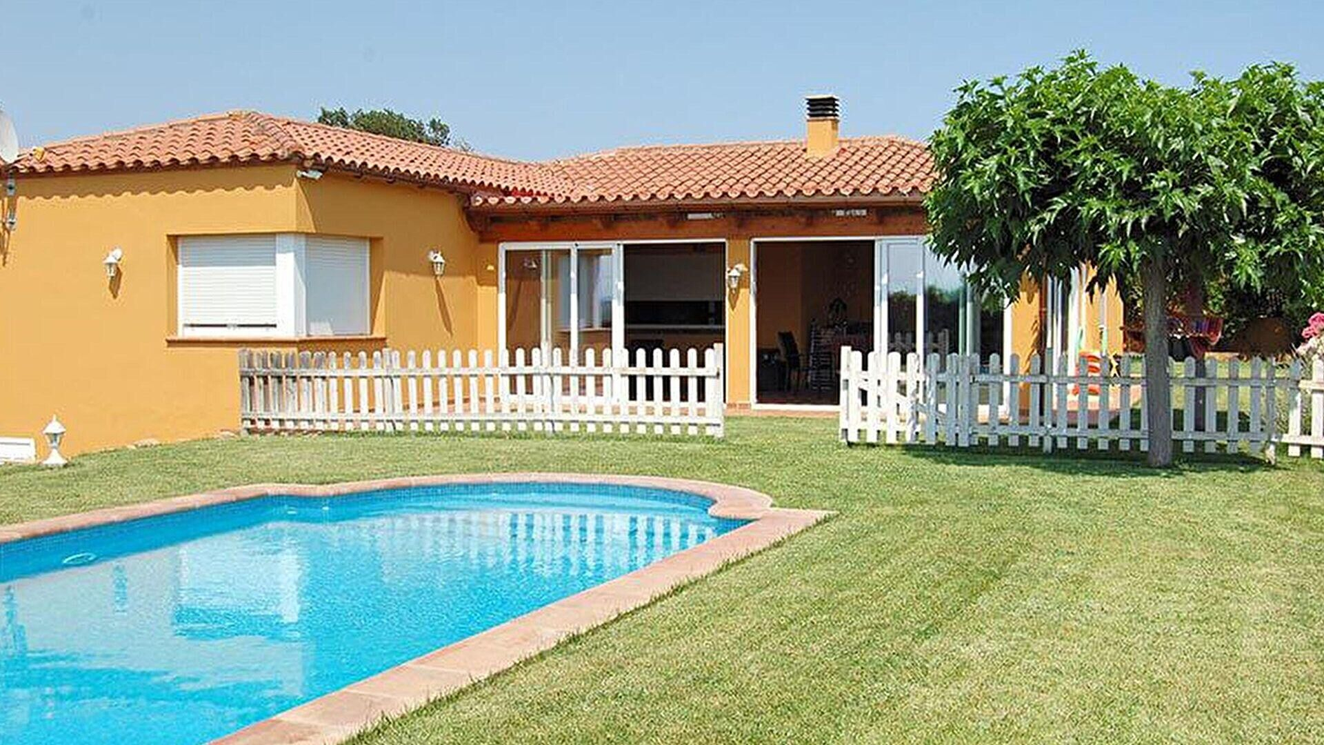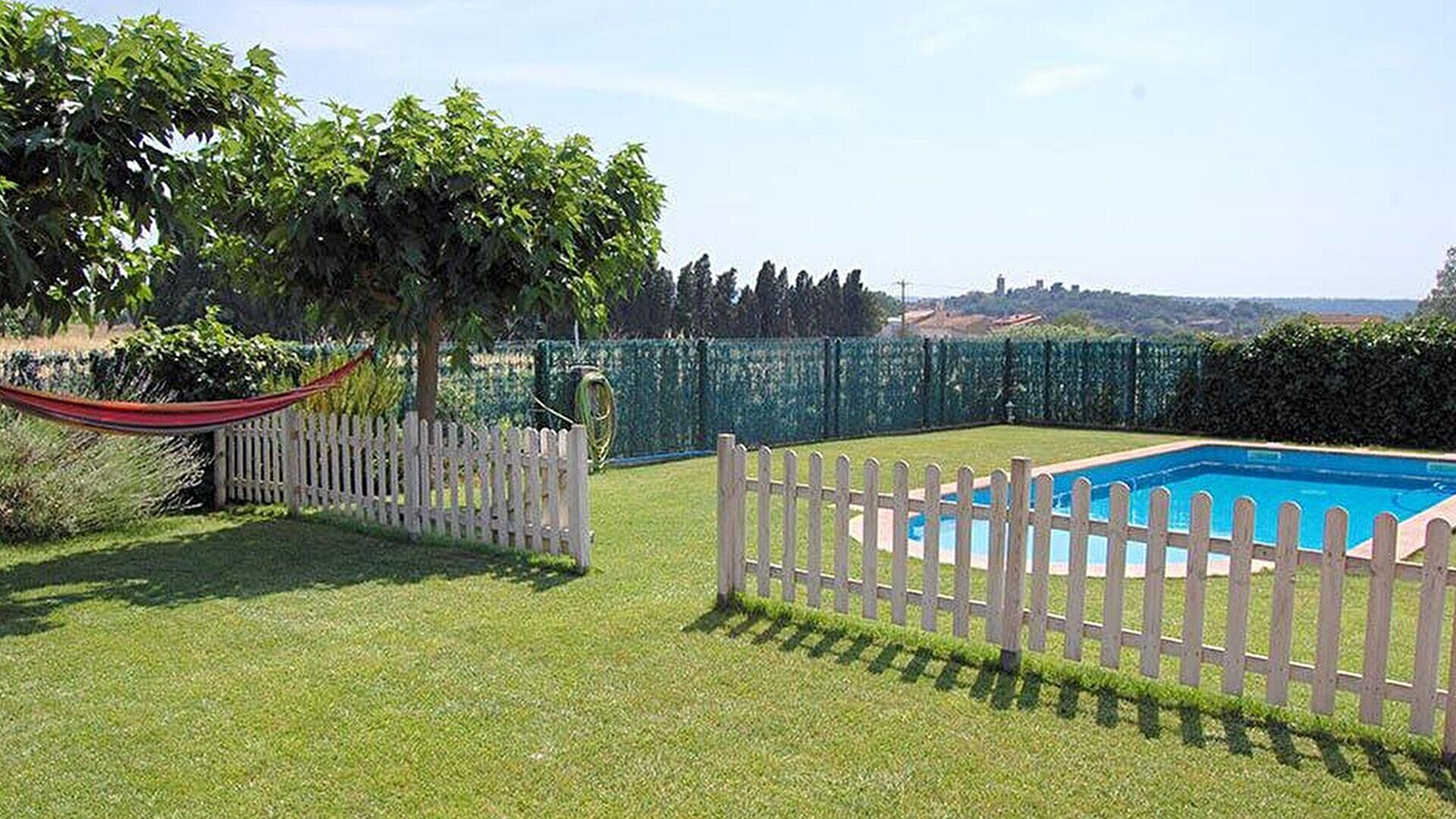 Jardin avec piscine, terrasse, salle de séjour, cuisine, 3 chambres, 1 salle de bain et 1 salle de bain avec douche.