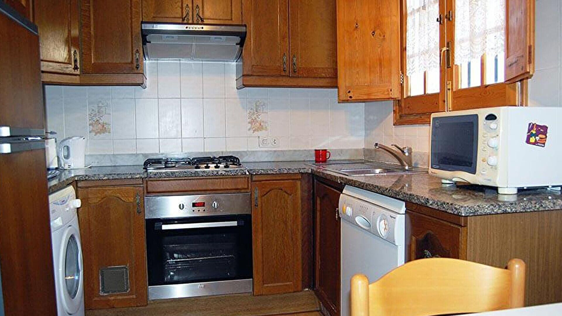 - Kitchen with gas hobb, oven, microwave, fridge and washing machine.