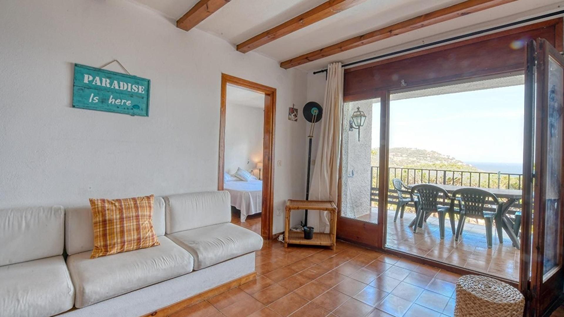 - Lounge with fire place, access to the terrace and sea view.