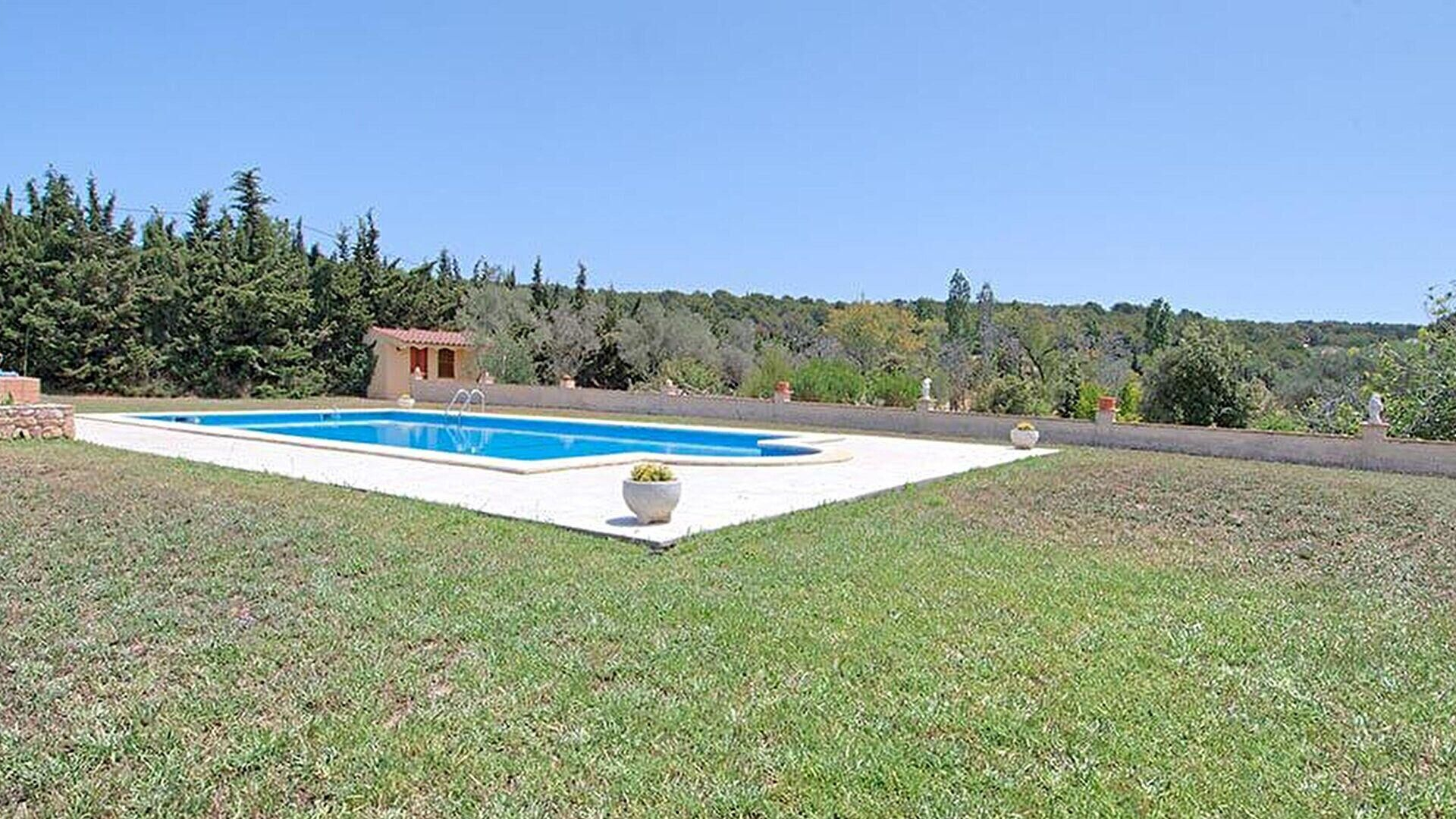 Garden with swimmng pool, terrace, porch, living/dining room, kitchen, 3 bedrooms, 2 bathrooms and store room.