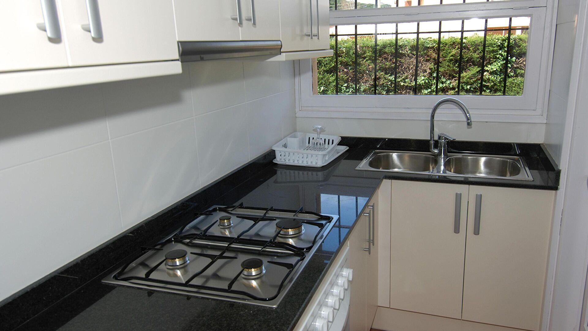 - Kitchen with gas hobb, oven, fridge and washing machine.