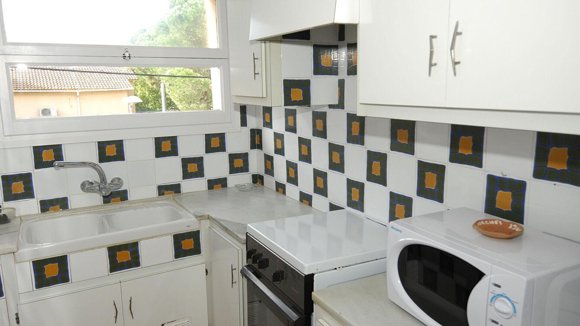 - Kitchen with gas hobb, oven, microwave, fridge and washing machine.