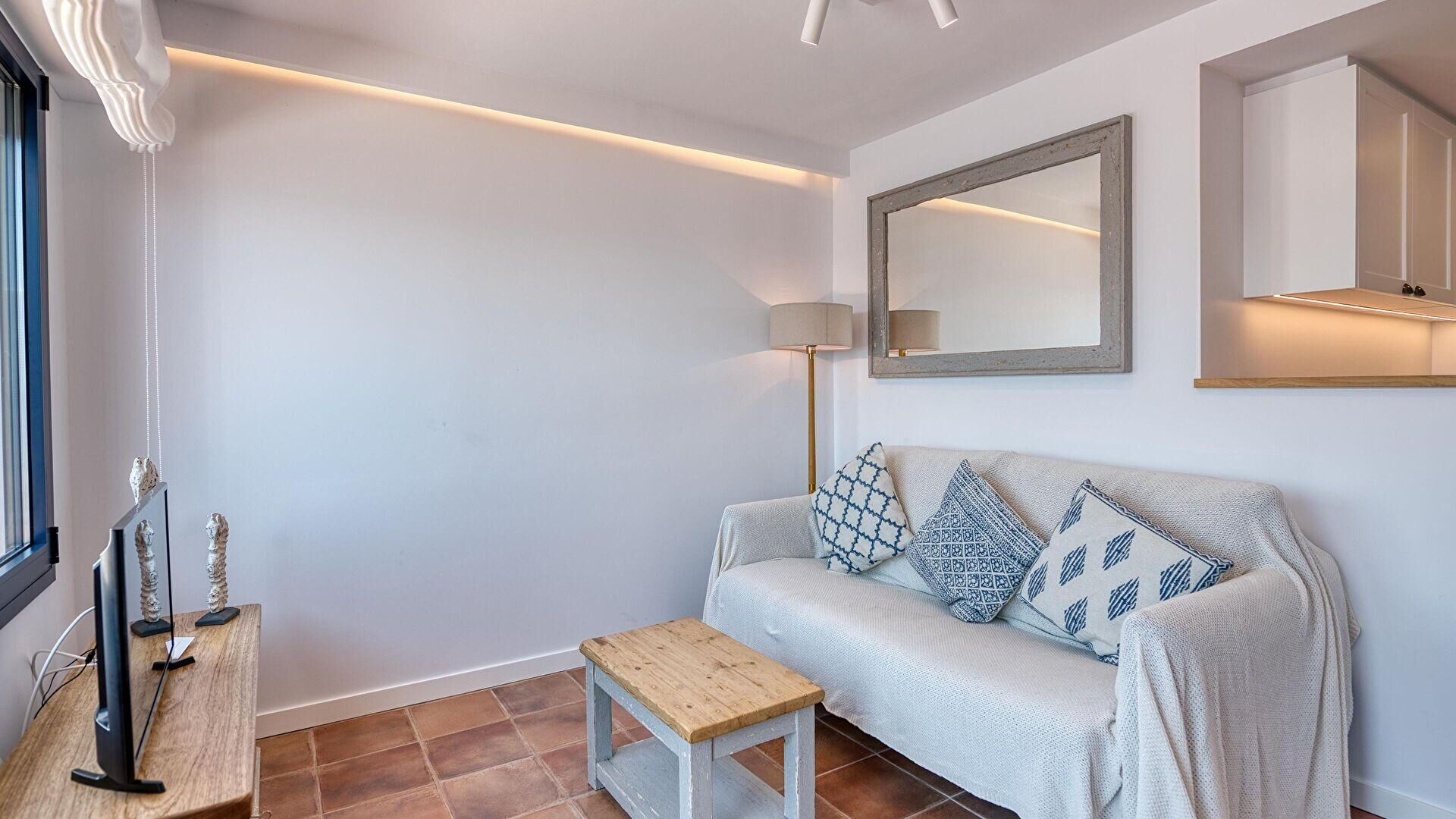 - Living/dining room with double sofa bed, television, fire place, access to the terrace, sea view and independent air conditionning and hot air units.