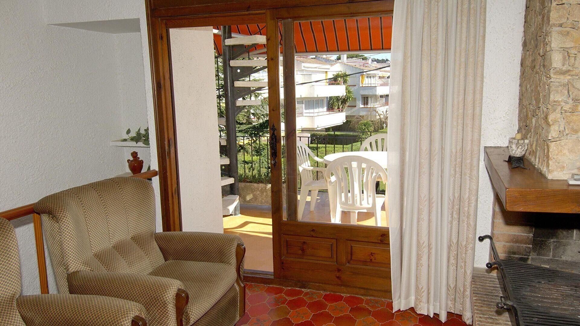 - Living/dining room, fire place, television and access to the terrace.