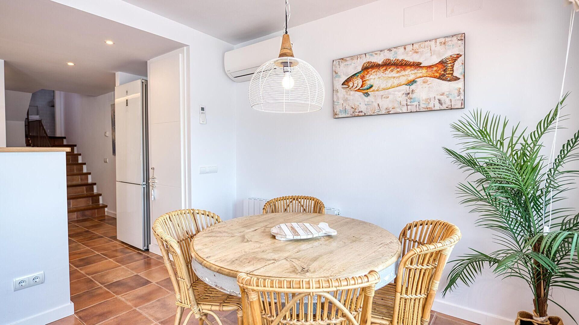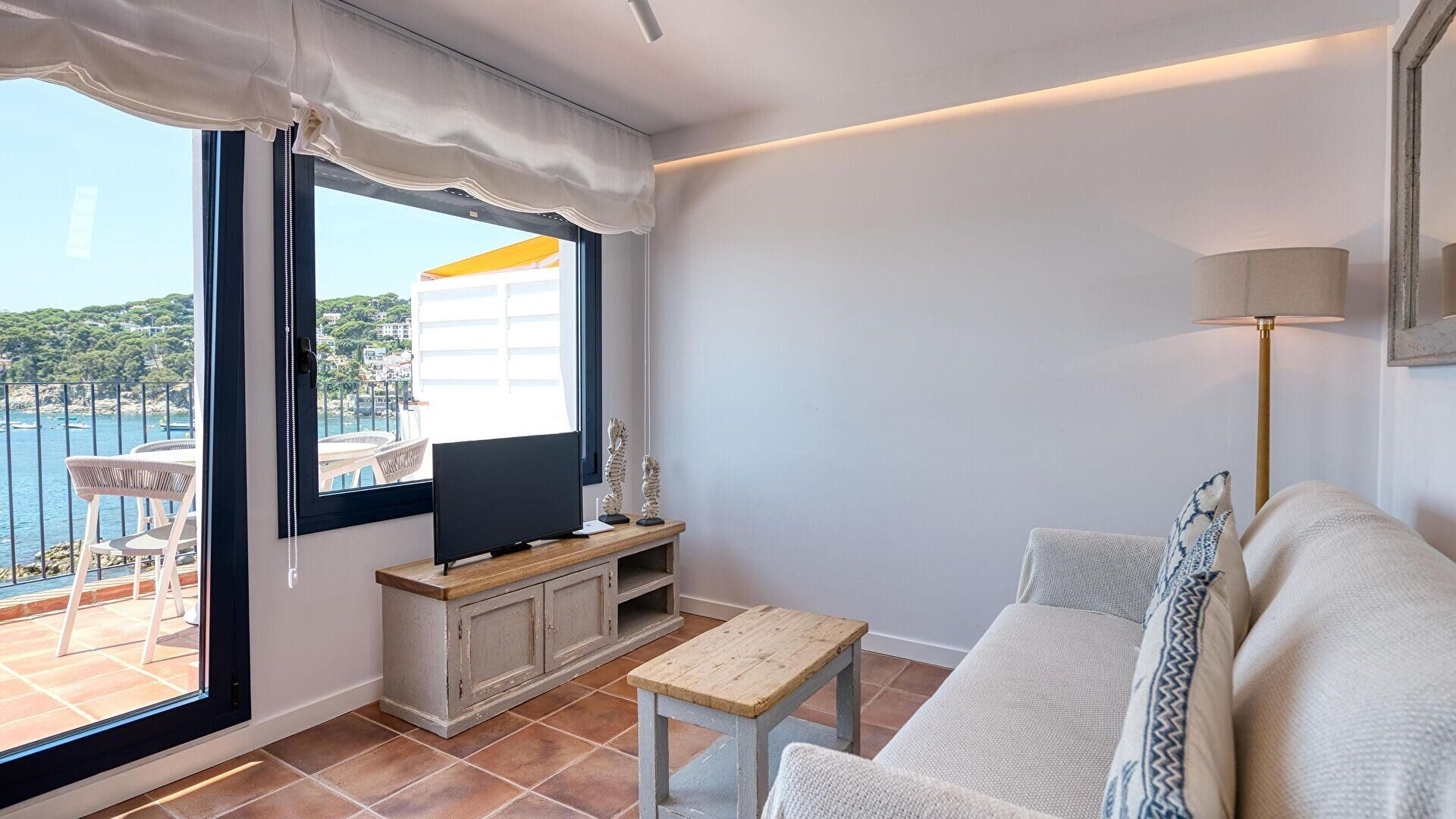 - Living/dining room with double sofa bed, television, fire place, access to the terrace, sea view and independent air conditionning and hot air units.