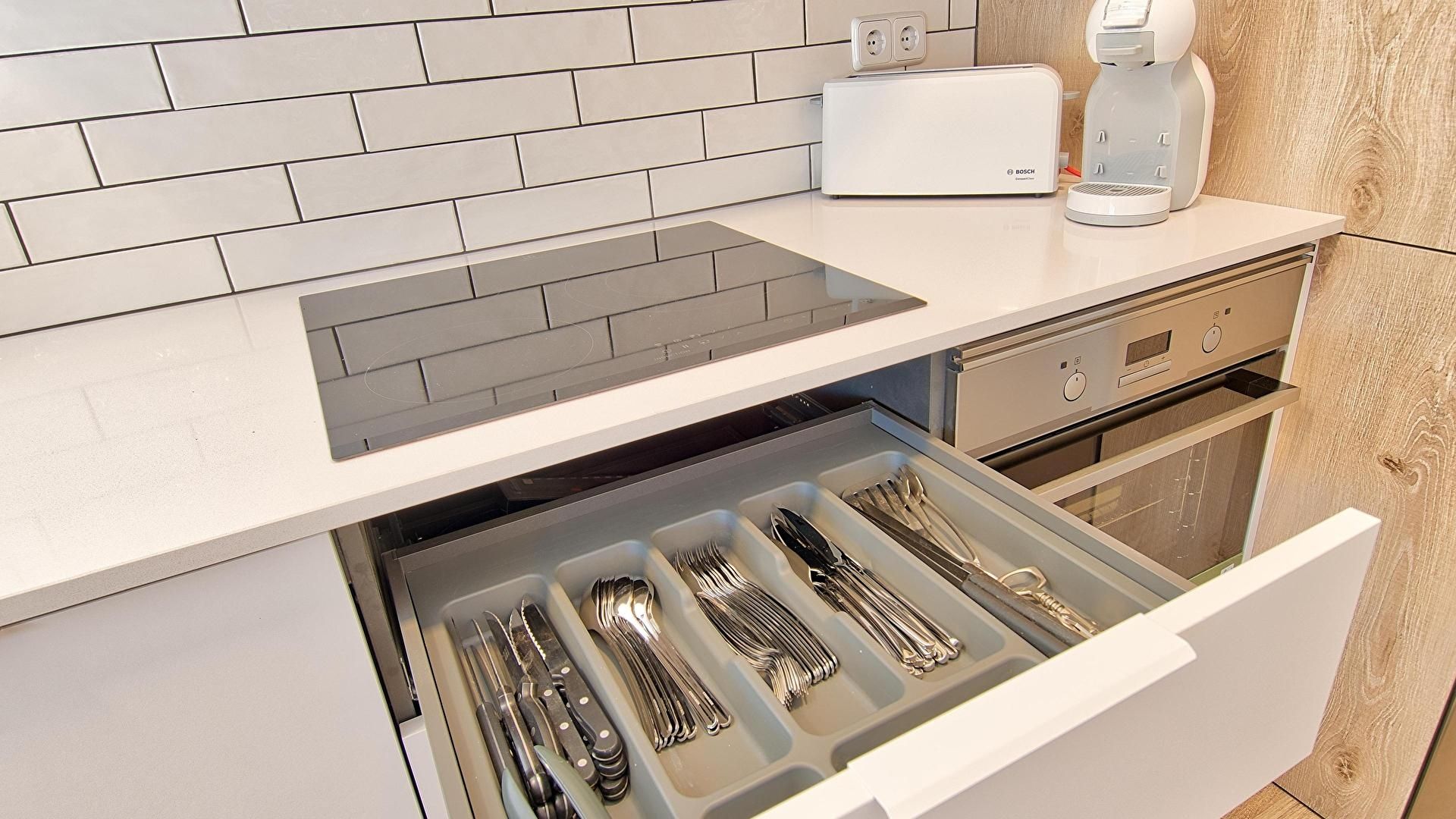 - Open american style kitchen with ceramic hobb, oven, microwave, fridge, washing machine and dishwasher.