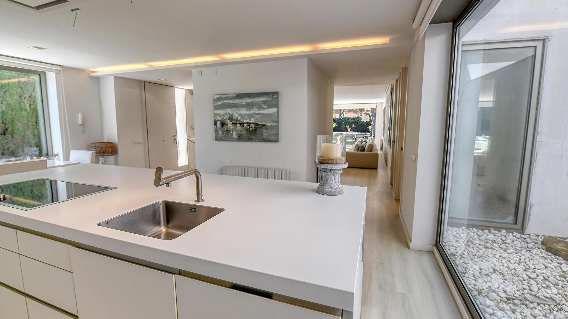 Garten, Wohnzimmer, offene Küche, 4 Schlafzimmer, 3 Bäder mit Dusche und Garage.