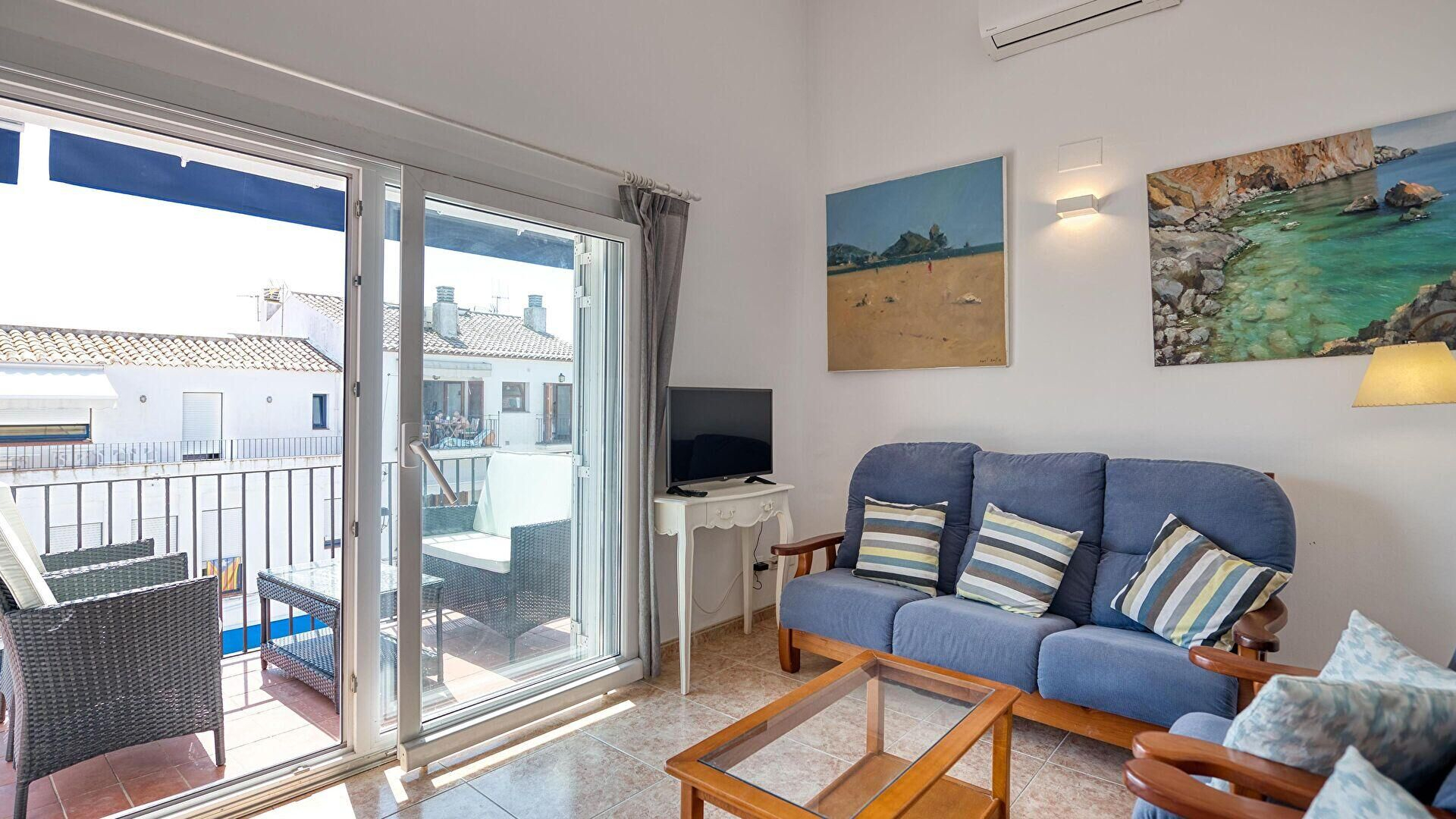 - Wohnzimmer-esszimmer, fernseher und ausgang zur terrasse.