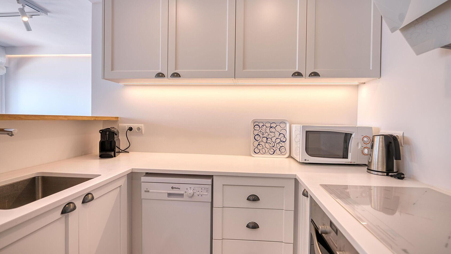 " Very well equipped and functioning apartment for a couple. Modern interior and a wonderful balcony with sun all day long and a wonderful view over the beach and the bay."