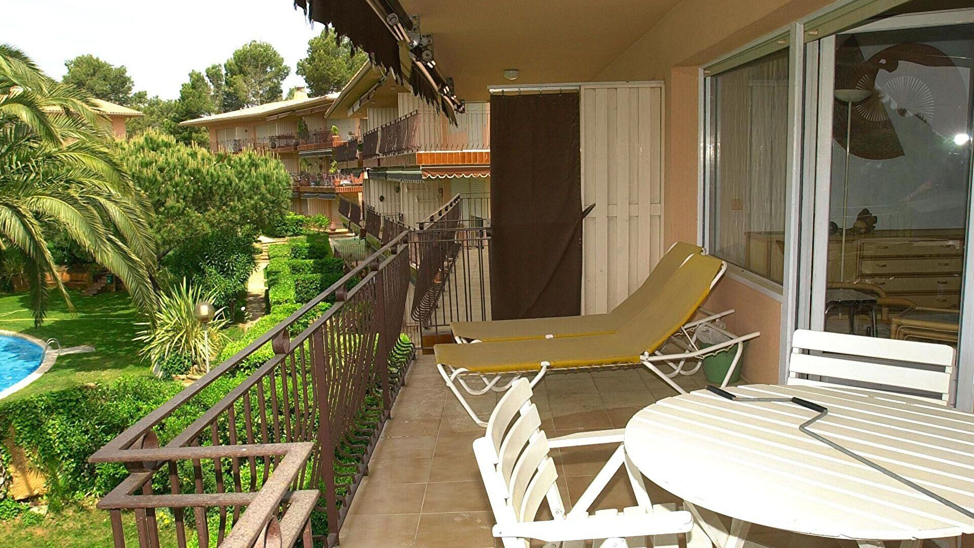 Gartenaussicht und Blick auf den Pool.
