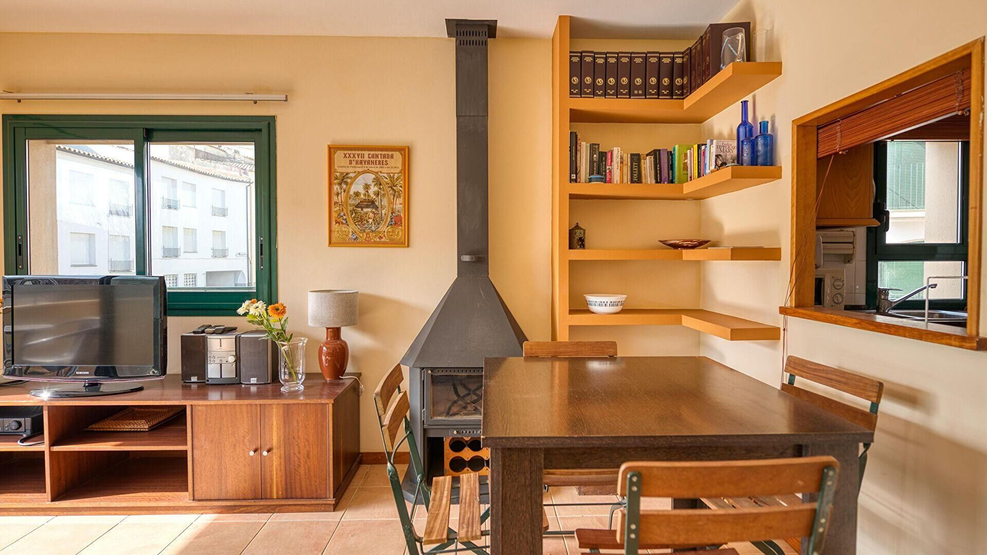 - Wohnzimmer-esszimmer, kamin, fernseher und ausgang zur terrasse.