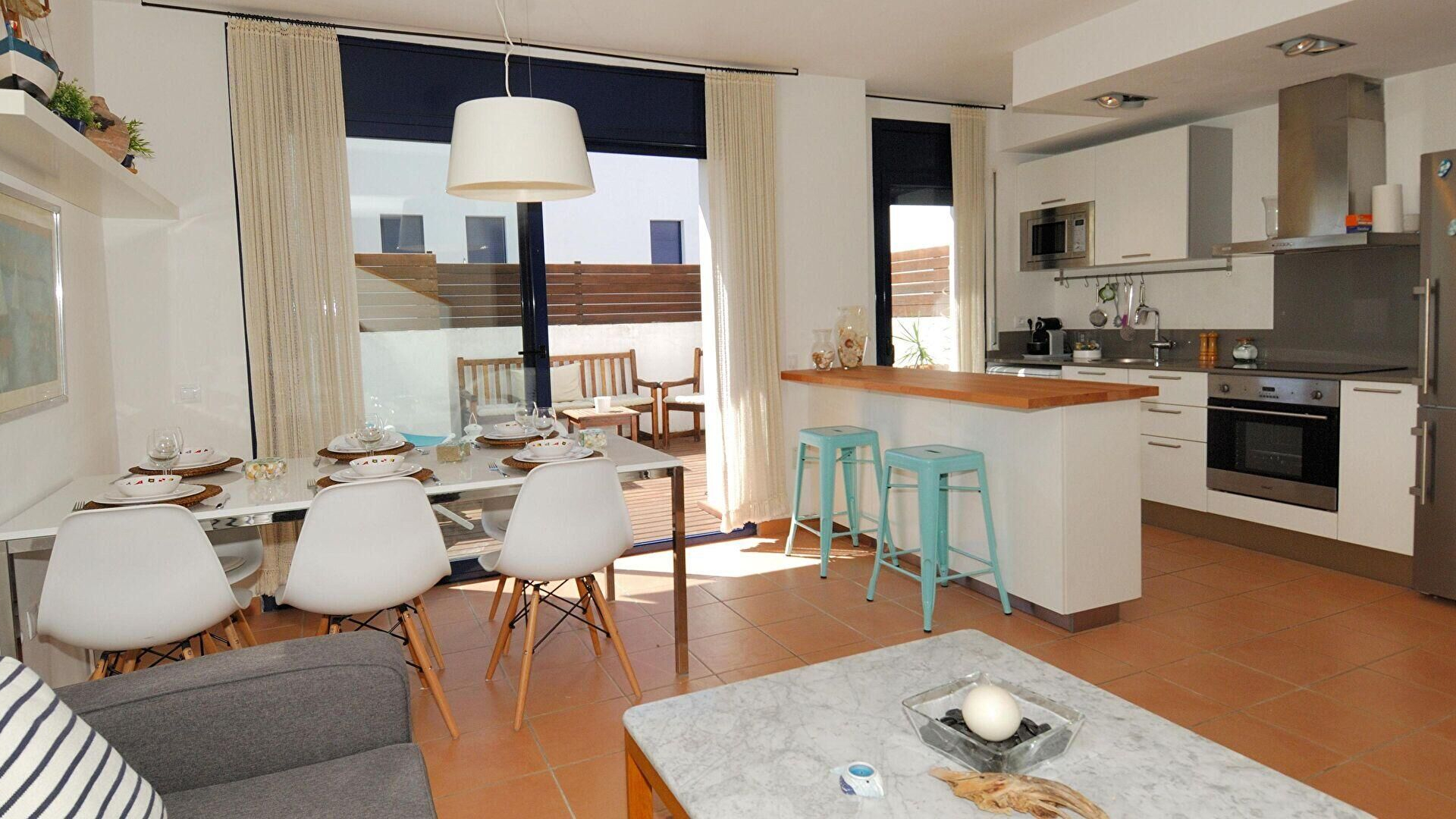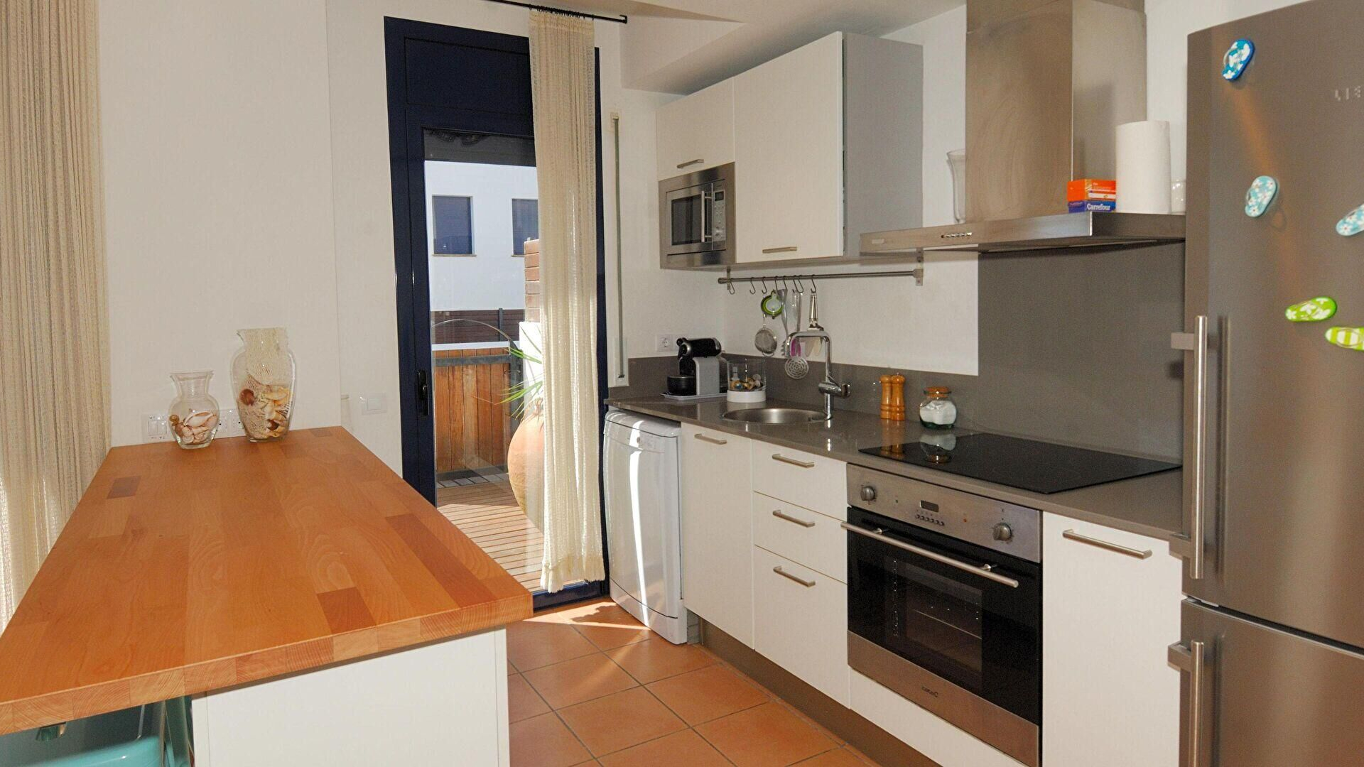- Offene küche mit glaskeramik-kochfeld, ofen, mikrowelle, kühlschrank, spülmaschine, waschmaschine, ausgang zur terrasse und wäschetrockner.
