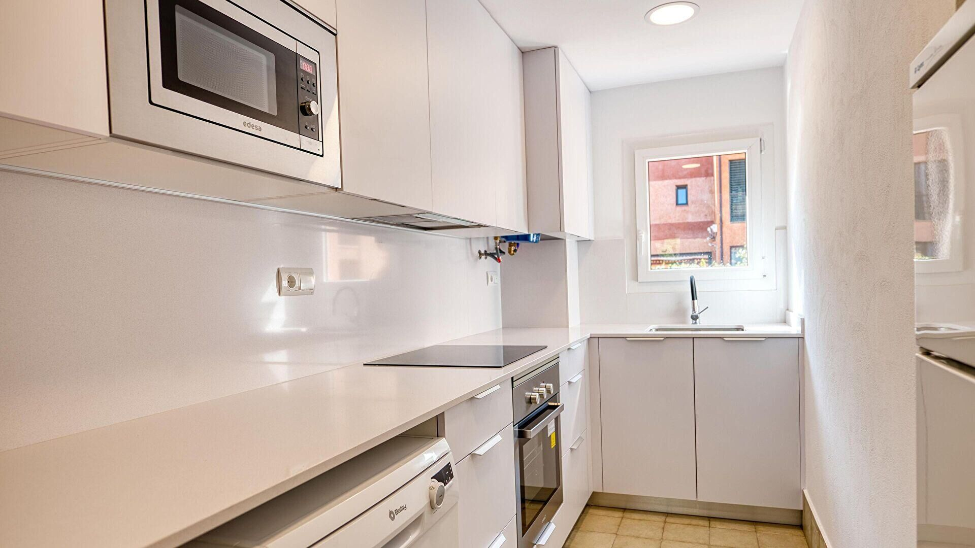 Elektrische Kochfeld, Ofen, Kühlschrank und Waschmaschine.