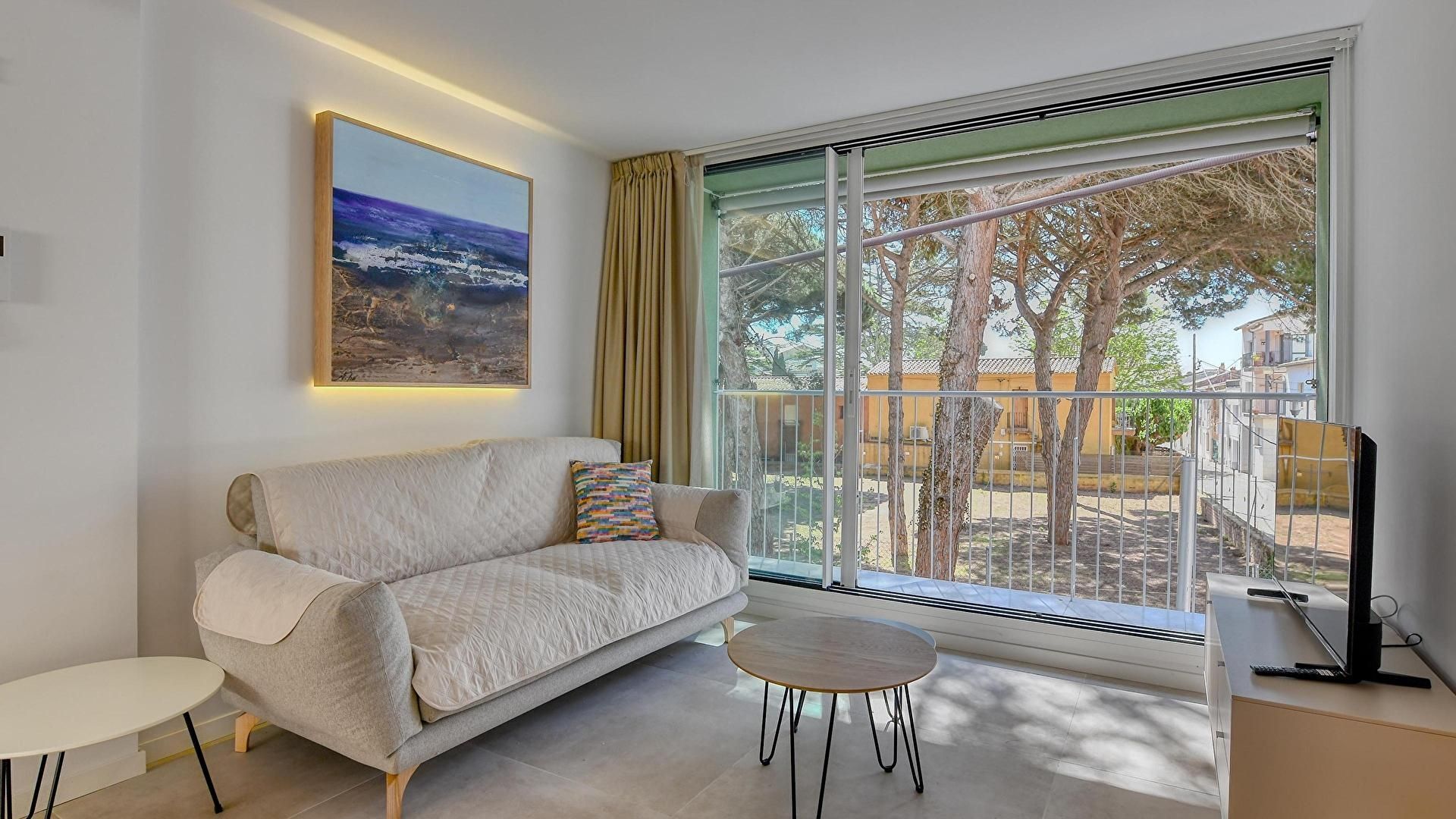 - Wohnzimmer-esszimmer mit fernseher und ausgang zur terrasse.