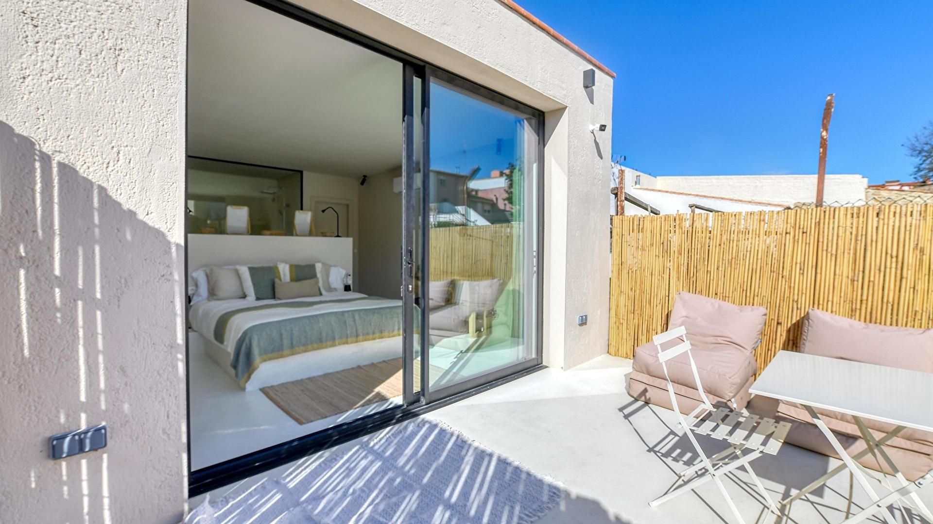 Schlafzimmer mit 1 doppelbett, bad mit badewanne (en suite) und ausgang zur terrasse-solarium.
