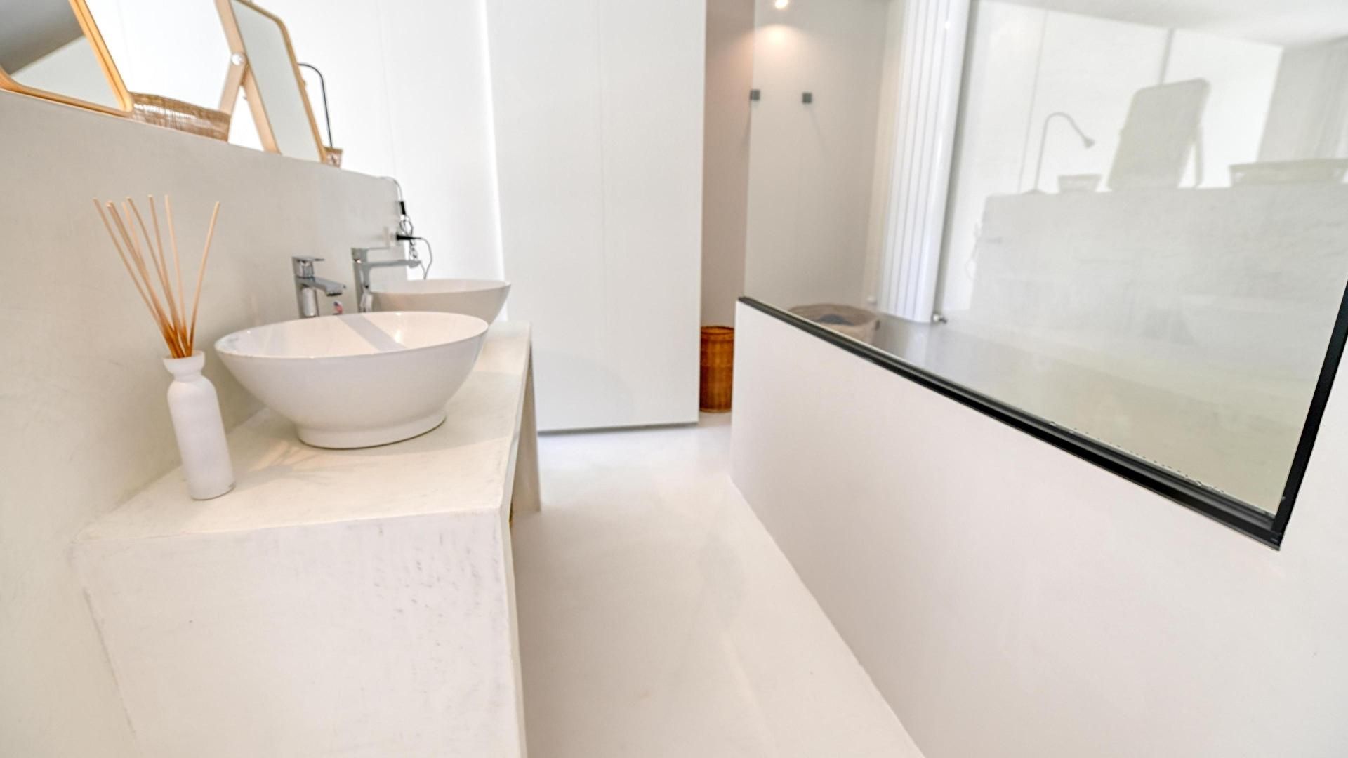 Garten mit Pool, 2 Chill-out, Wohnzimmer, offene Küche, 3 Schlafzimmer, 3 Bäder mit Badewanne und 1 Bad mit Dusche.