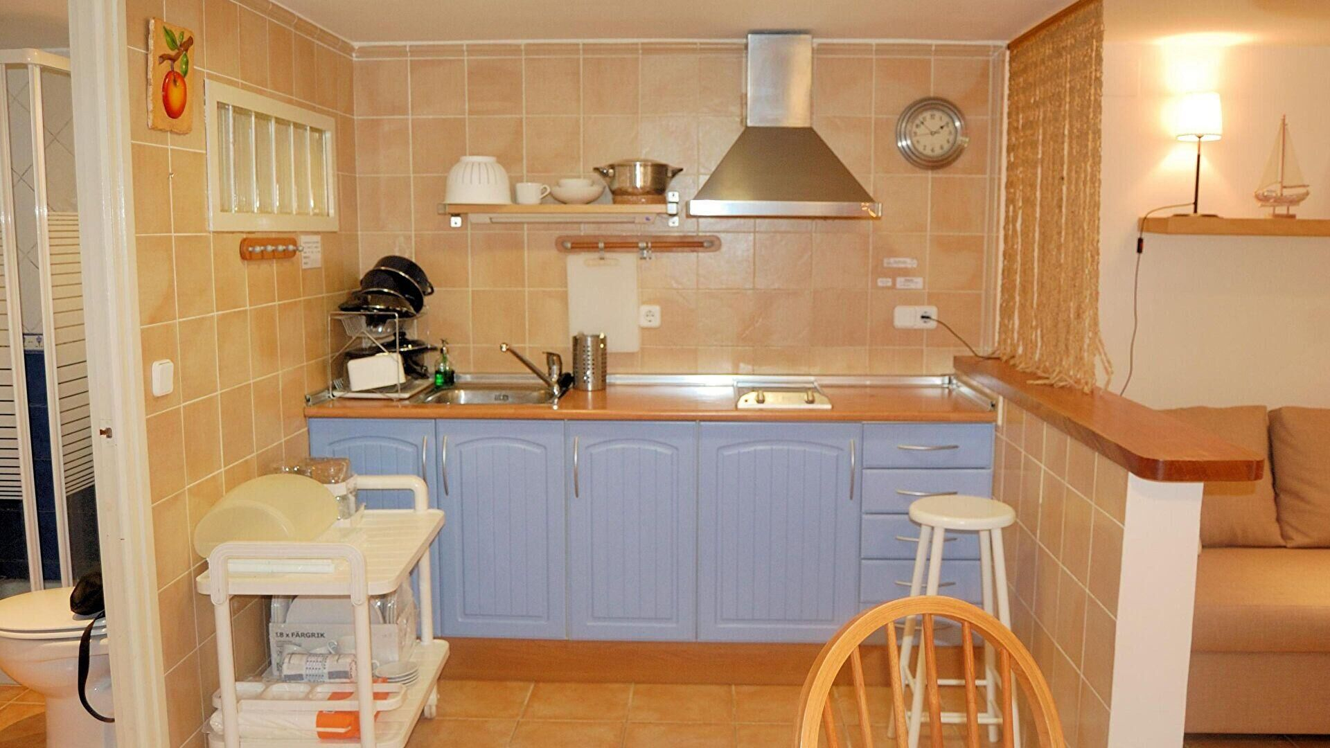 - Offene küche mit elektrische kochfeld, kombi-kühlschrank, mikrowelle und ausgang zur terrasse.