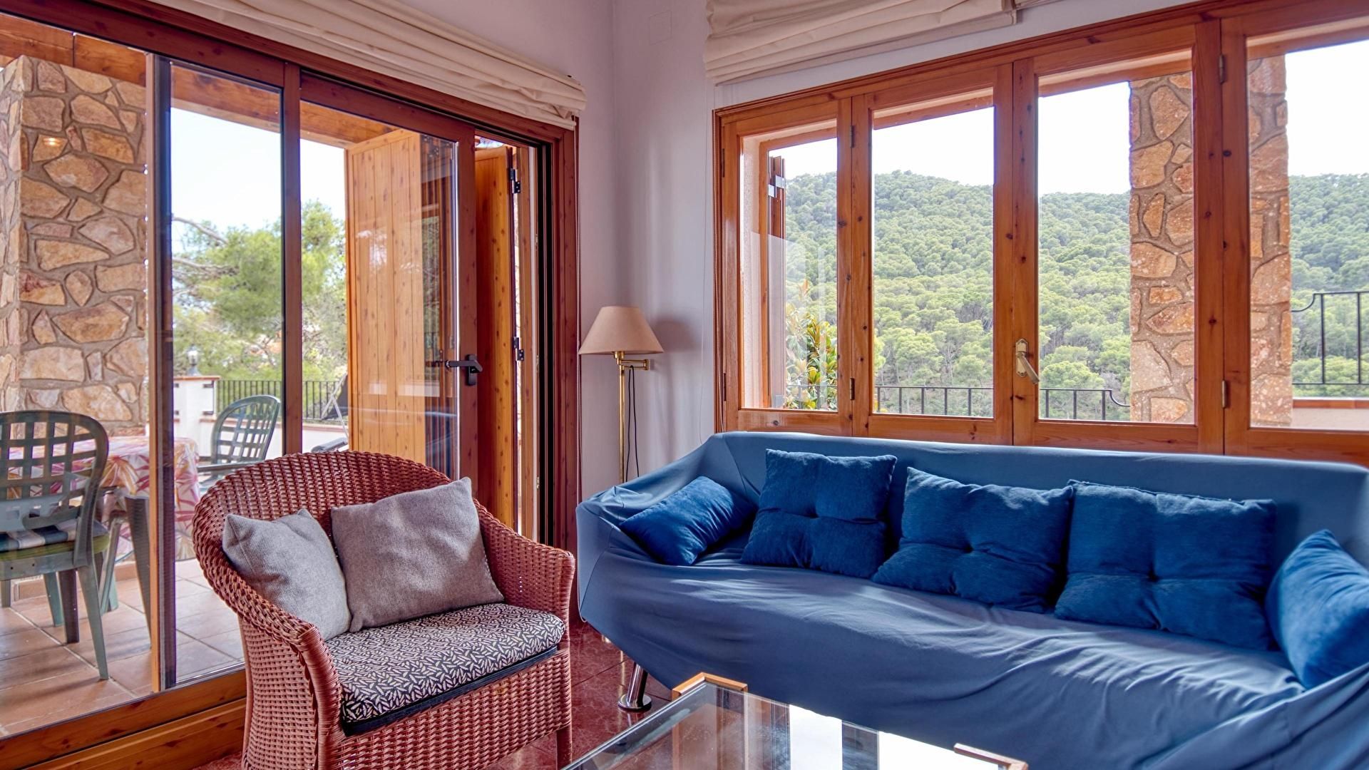 - Wohnzimmer-esszimmer mit fernseher, kamin und ausgang zur terrasse.