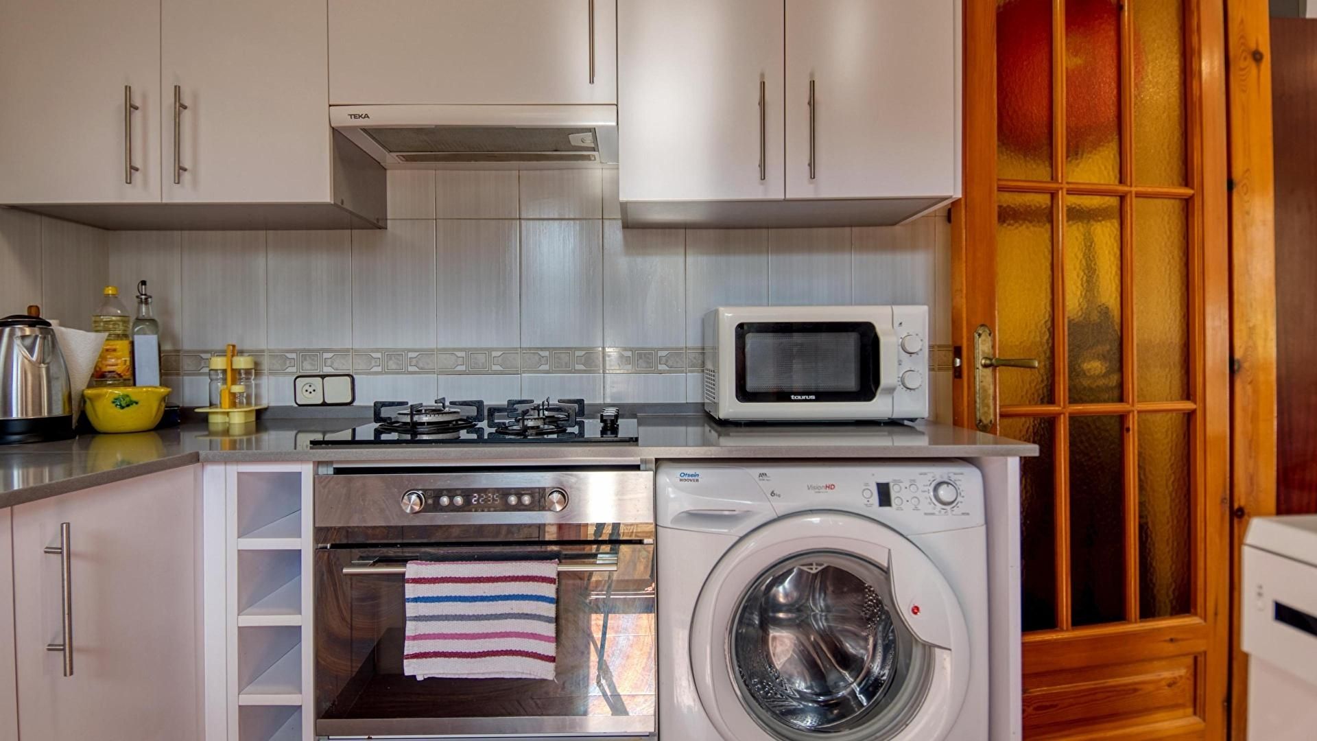 - Küche mit gaskochfeld, ofen, mikrowelle, waschmaschine, kombi-kühlschrank, ausgang zum privaten garten und spülmaschine.